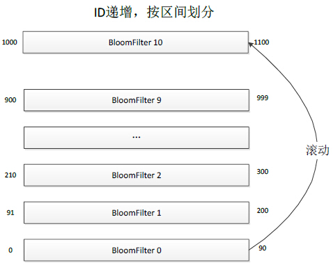 就像下图所描述的那样,Phantom跟CounterService一样,采取了分Table的存储方案,不同的是CounterService中每个Table存储的是KV,而Phantom的每个Table是一个完整的BloomFilter,每个BloomFilter存储的某个ID范围段的Key,所有Table形成一个列表并按照Key范围有序递增。当所有Table都存满的时候,就把最小的Table数据清除,存储最新的Key,这样的话最小的Table就滚动成为最大的Table了。