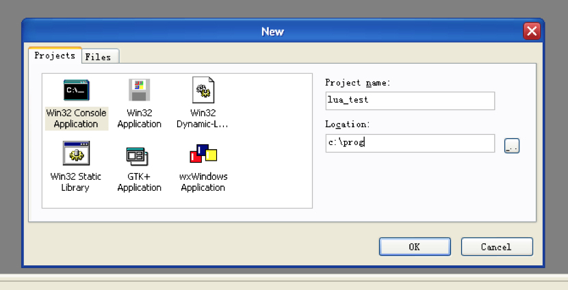 开始,我们还是使用MinGW Development Studio来创建一个工程。由于只是示例,所以名字可以任意取。我取一个叫作lua_test的工程名,并且将工程设置为Win32 Console Application。你可以看这个示例图。-