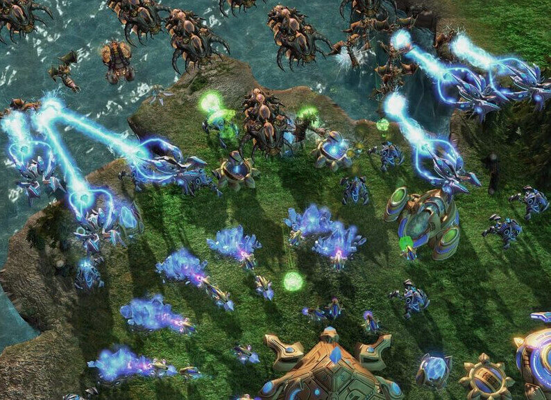 你可以看到,3D画面几乎要在高清画质的情况下才能看清楚单位兵种、战斗场面,而且很多时候都是一团黑漆漆、绿乎乎的3D画面堆在一起。《LOL》看似没有这种情况,是因为大家都熟悉每个英雄的形象,加上地图比较明亮,兵种没有《星际争霸》那么多。