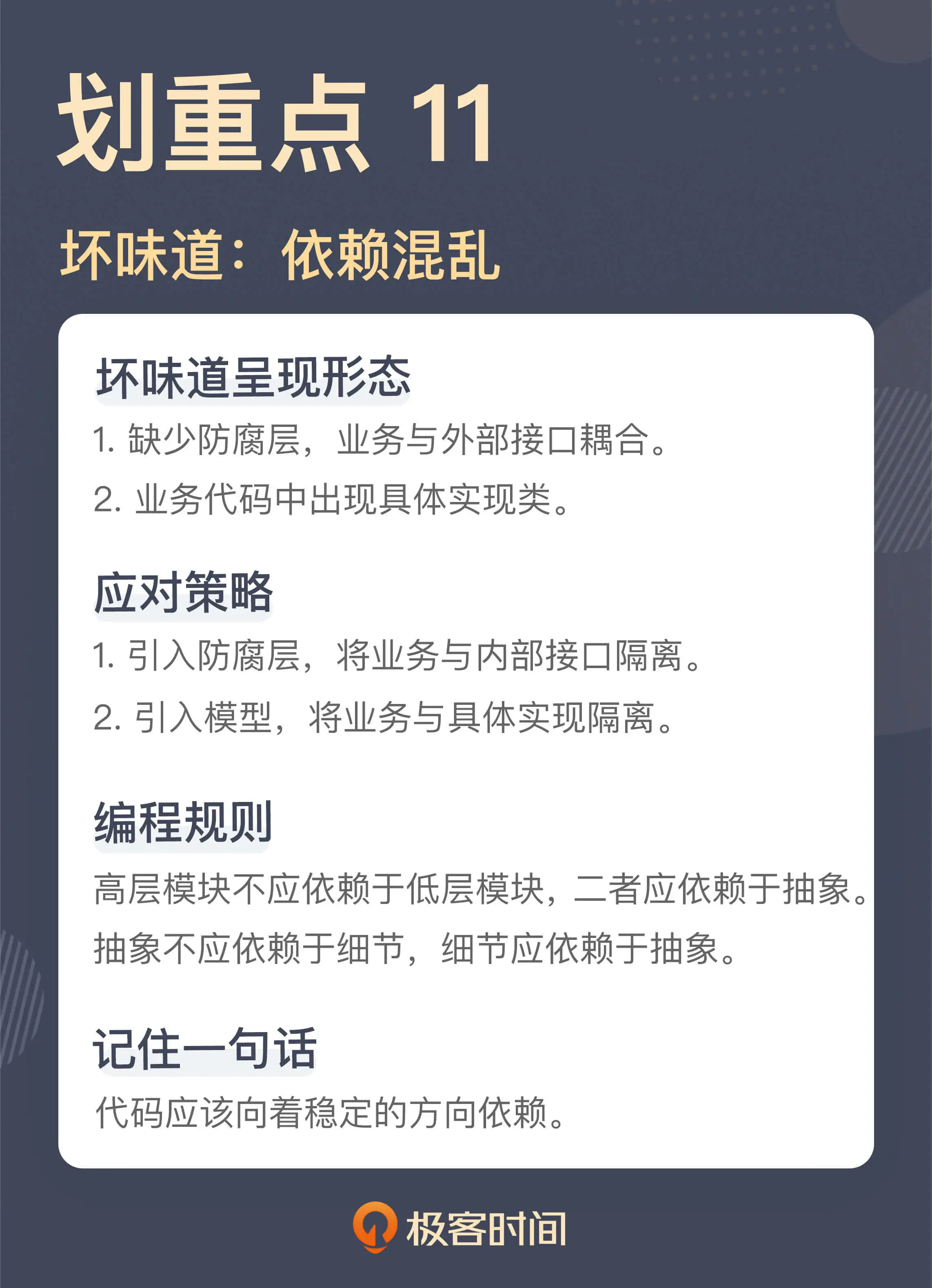 今天我们讲了由于代码依赖关系而产生的坏味道,一种是缺少防腐层,导致不同代码糅合在一起,一种是在业务代码中出现了具体的实现类。