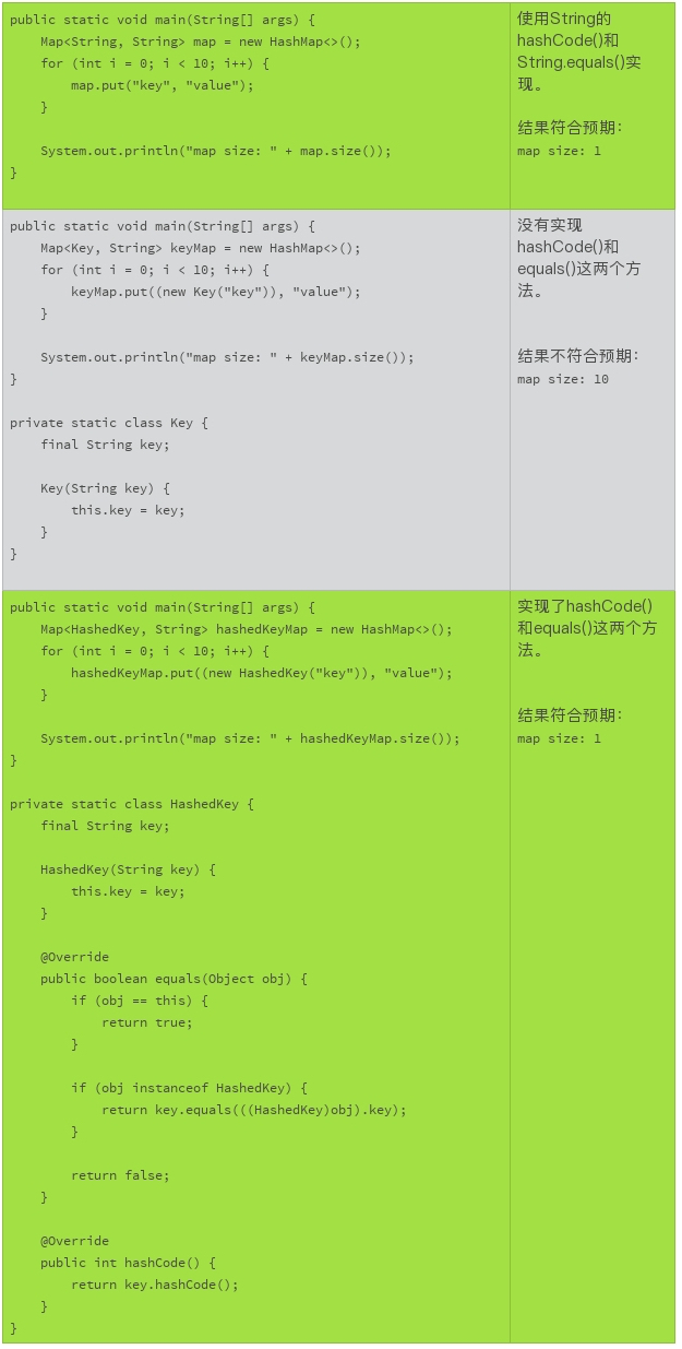 在使用Hashtbale、HashMap、HashSet这样的依赖哈希(hash)值的集合时,有时候我们会忘记要检查产生哈希值的对象,一定要实现hashCode()和equals()这两个方法。缺省的hashCode()实现,返回值是每一个对象都不同的数值。即使是相等的对象,不同的哈希值,使用基于哈希值的集合时,也会被看作不同的对象。这样的行为,可能不符合我们的预期。而且,使用没有实现hashCode()和equals()这两个方法的对象,可能会造成集合的尺寸持续增加,无端地占用内存,甚至会造成内存的泄漏。