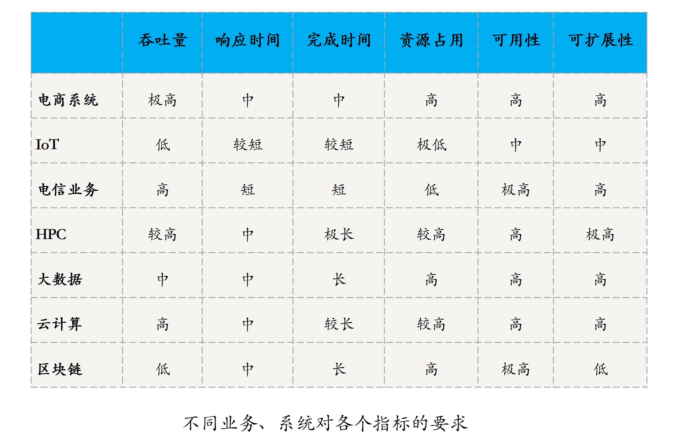 接下来,我带你一起看一下典型的电商、IoT、电信、HPC(高性能计算)、大数据、云计算、区块链等业务或系统对不同指标的诉求。