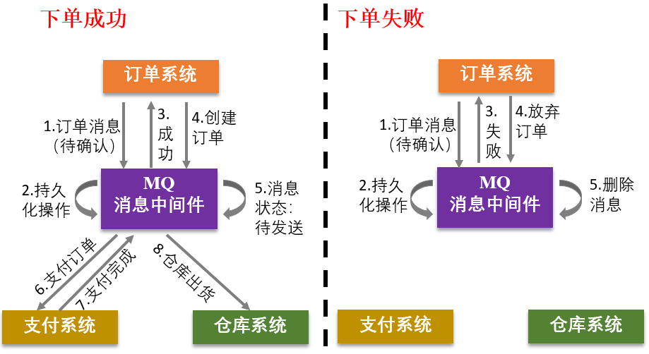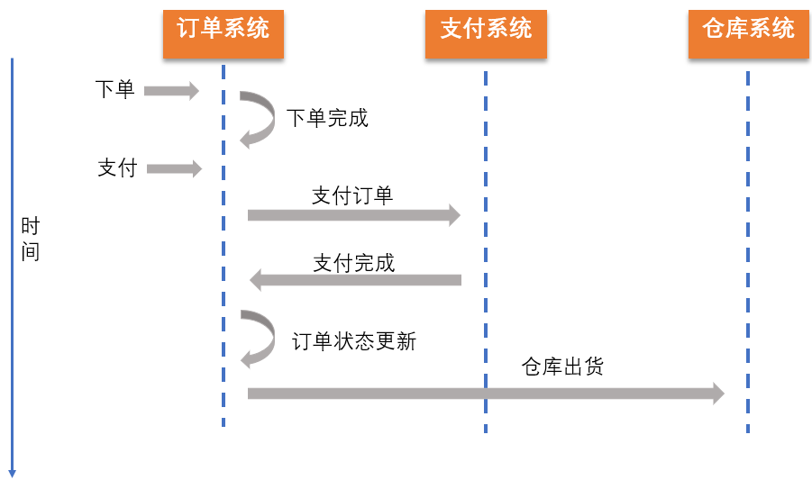 在该事件中,涉及到了订单系统、支付系统、仓库系统,这三个系统是相互独立的应用,通过远程服务进行调用。