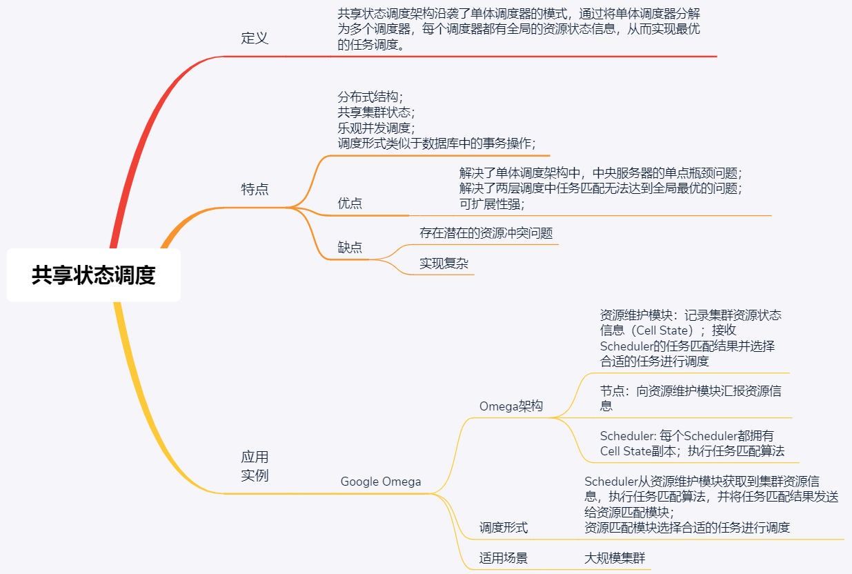 共享状态调度,多个调度器,每个调度器都可以看到集群的全局资源信息,并根据这些信息进行任务调度。相较于其他两个调度架构来说,共享状态调度架构适用的集群规模最大。