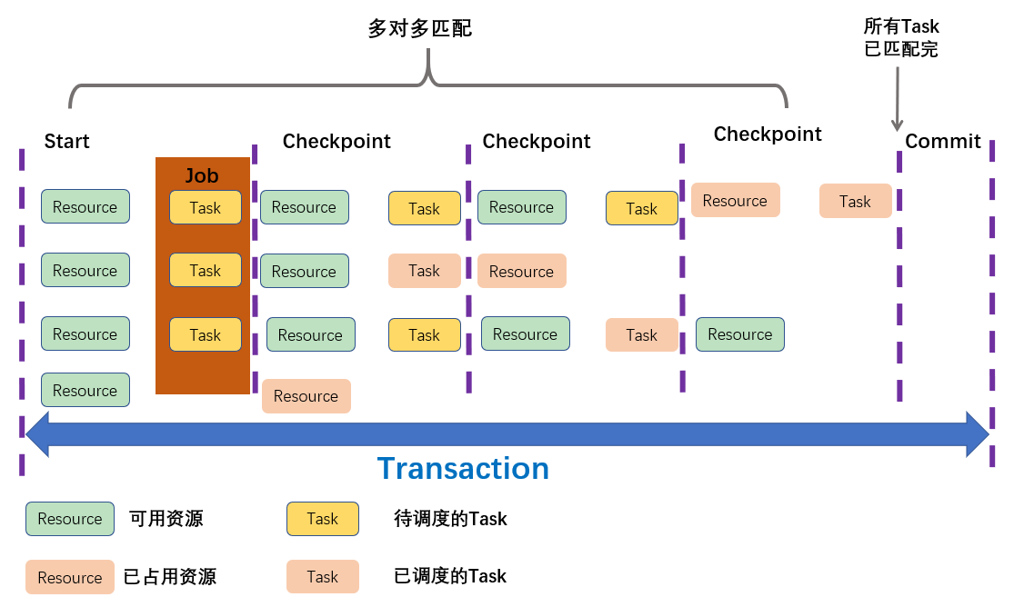 如下图所示,在一个应用执行的过程中,调度器会将一个Job中的所有Task与Resource进行匹配,可以说Task与Resource之间是进行多对多匹配的。其间,调度器会设置多个Checkpoint来检测Resource是否都已经被占用,只有这个Job的所有Task可以匹配到可用资源时,这个Job才可以被调度。