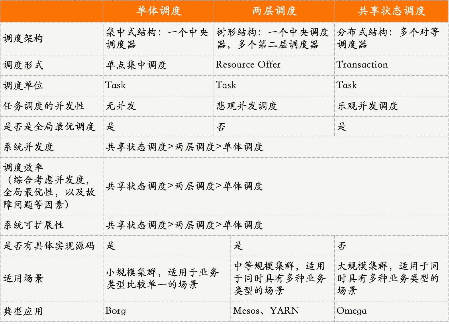 我将单体调度、两层调度、共享状态调度总结在了一张表格中: