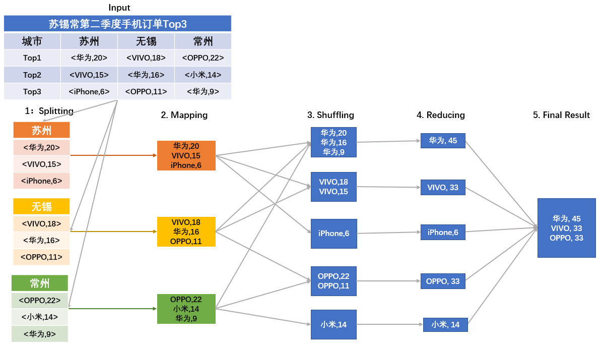 2. 通过循环调用map()函数,统计每个品牌手机的订单数量。其中,key为手机品牌,value为手机购买数量(单位:万台)。如下图Mapping阶段所示(为简化描述,图中直接列出了统计结果)。