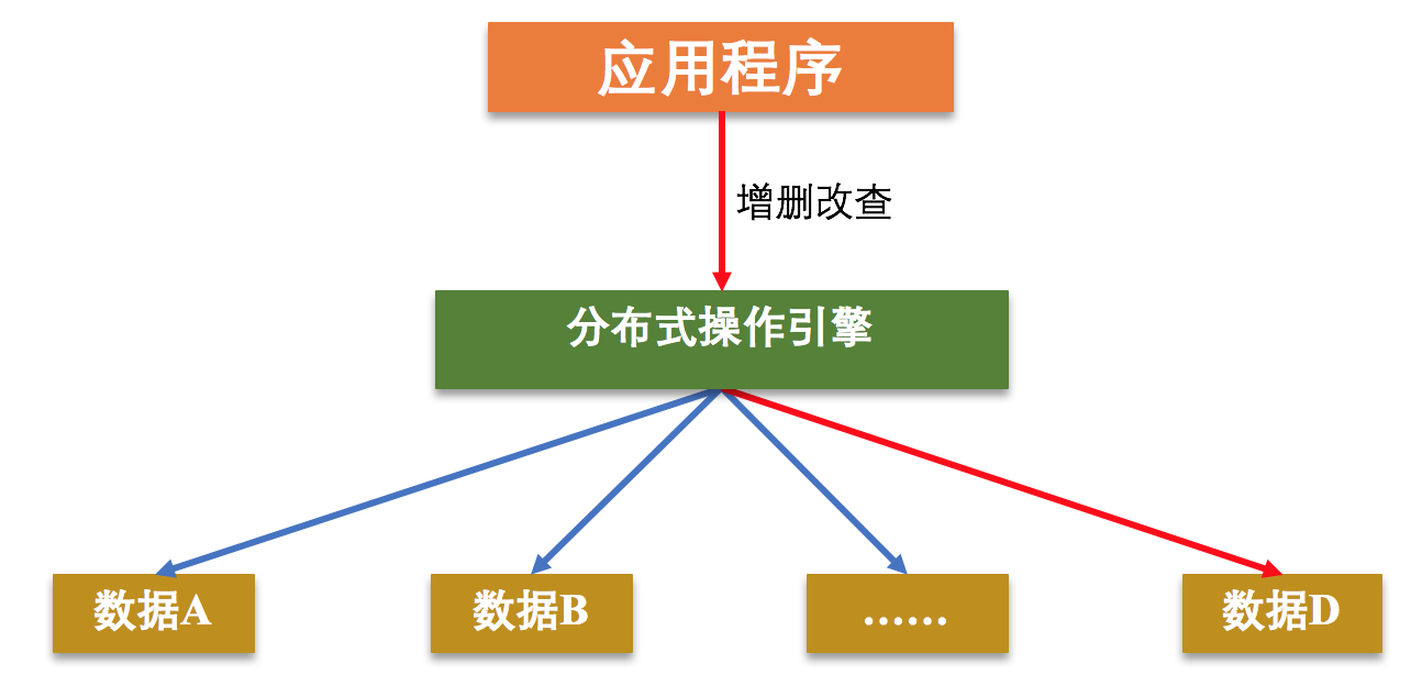 如下图所示,当用户(即应用程序)想要访问数据D,分布式操作引擎通过一些映射方式,比如Hash、一致性Hash、数据范围分类等,将用户引导至数据D所属的存储节点获取数据。