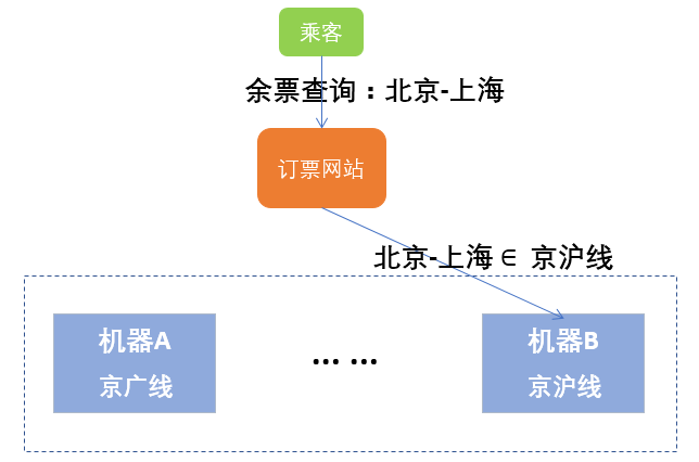 如图所示,当用户查询北京-上海的火车票相关信息时,首先判断查询条件属于哪个范围,由于北京-上海的火车线路属于京沪线,因此系统按照规则将查询请求转到存取京沪线火车票数据的机器B,然后由机器B进行处理并给用户返回响应结果。