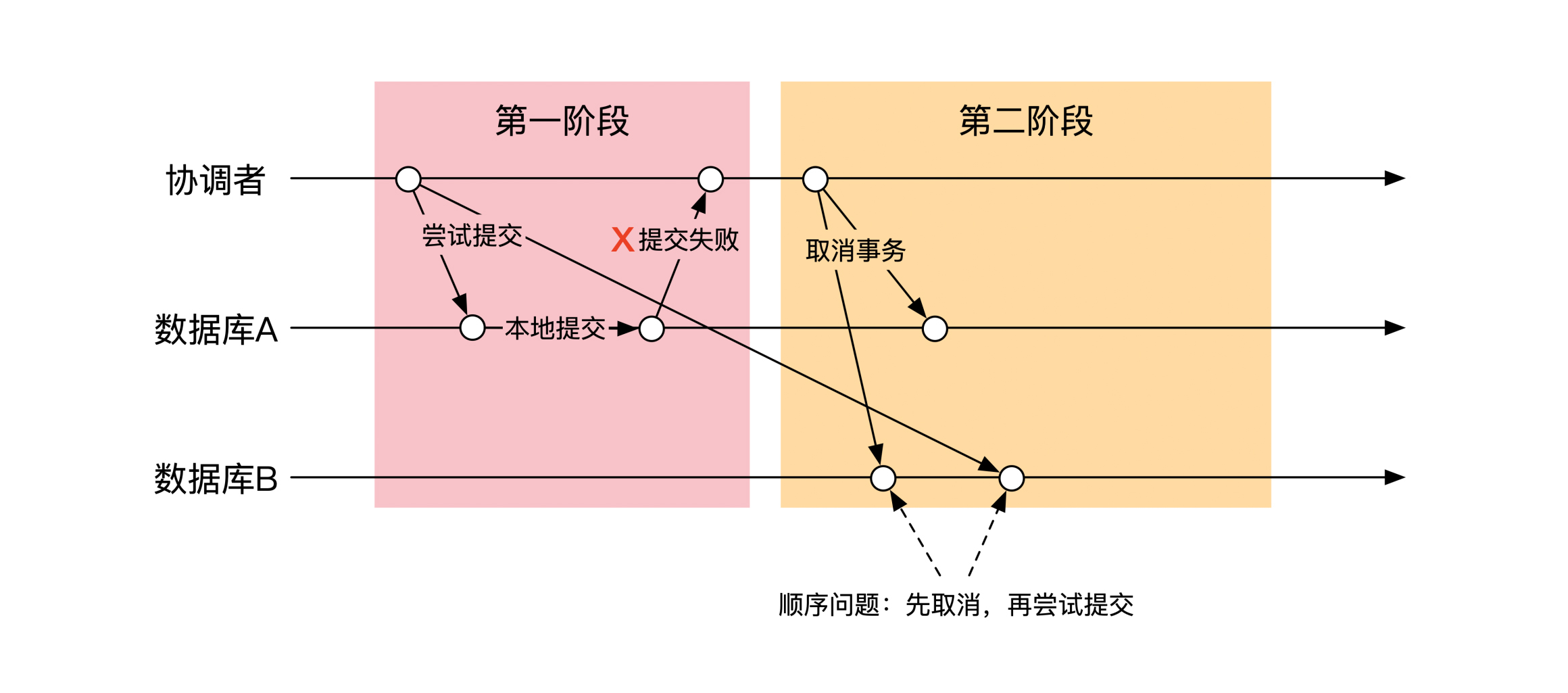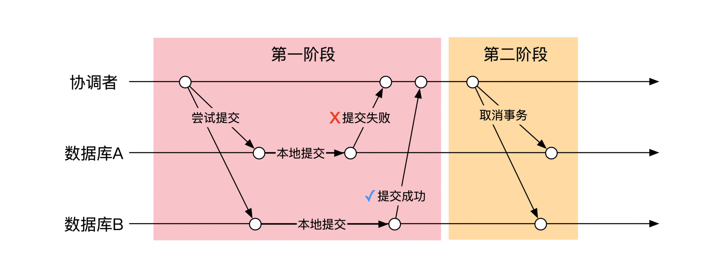 如果有任何一台机器在第一阶段出了问题,协调者会在第二阶段通知所有数据库回滚在第一阶段的操作。