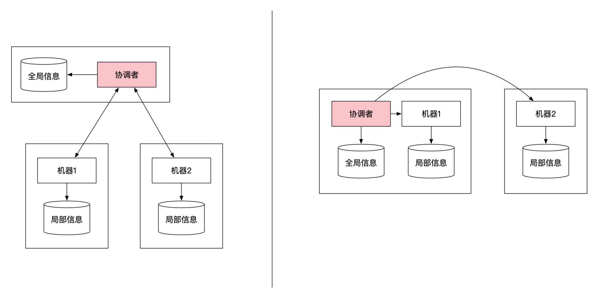 协调者只是一个角色,它既可以是一台单独的机器,也可以是集群里的某一台机器。下面这幅图列举了这两种不同的协调者选择方式: