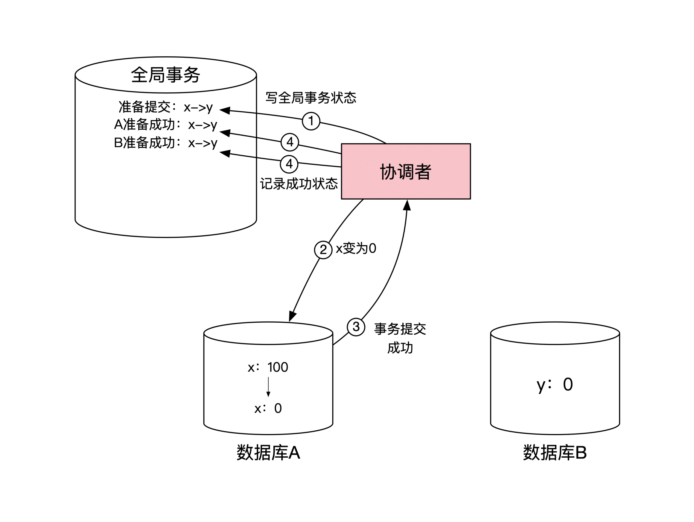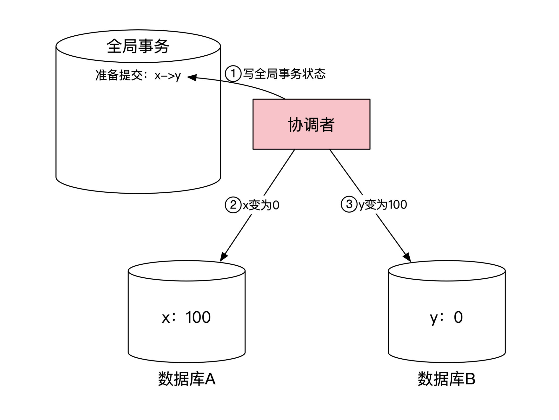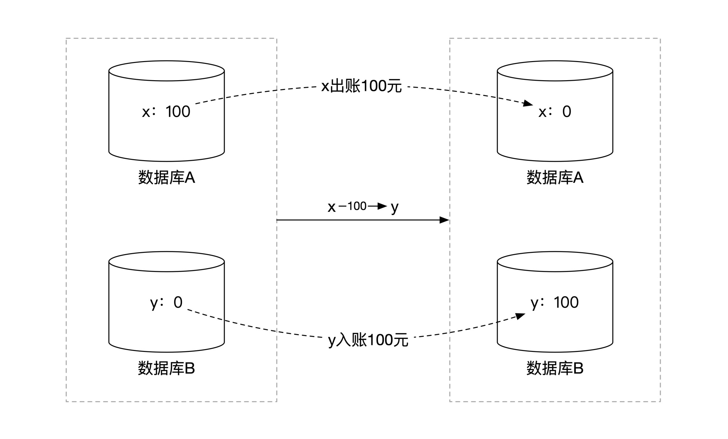 假设和前面一样,一个用户 x 的账户开始有100元钱,账户信息存储在数据库 A 中。另一个用户 y 的账户里最开始没钱,账户信息存储在数据库 B 中。然后系统发起了一笔从 x 到 y 的转账,金额为100元。所以转账后 x 的余额为0,而 y 的余额为100。