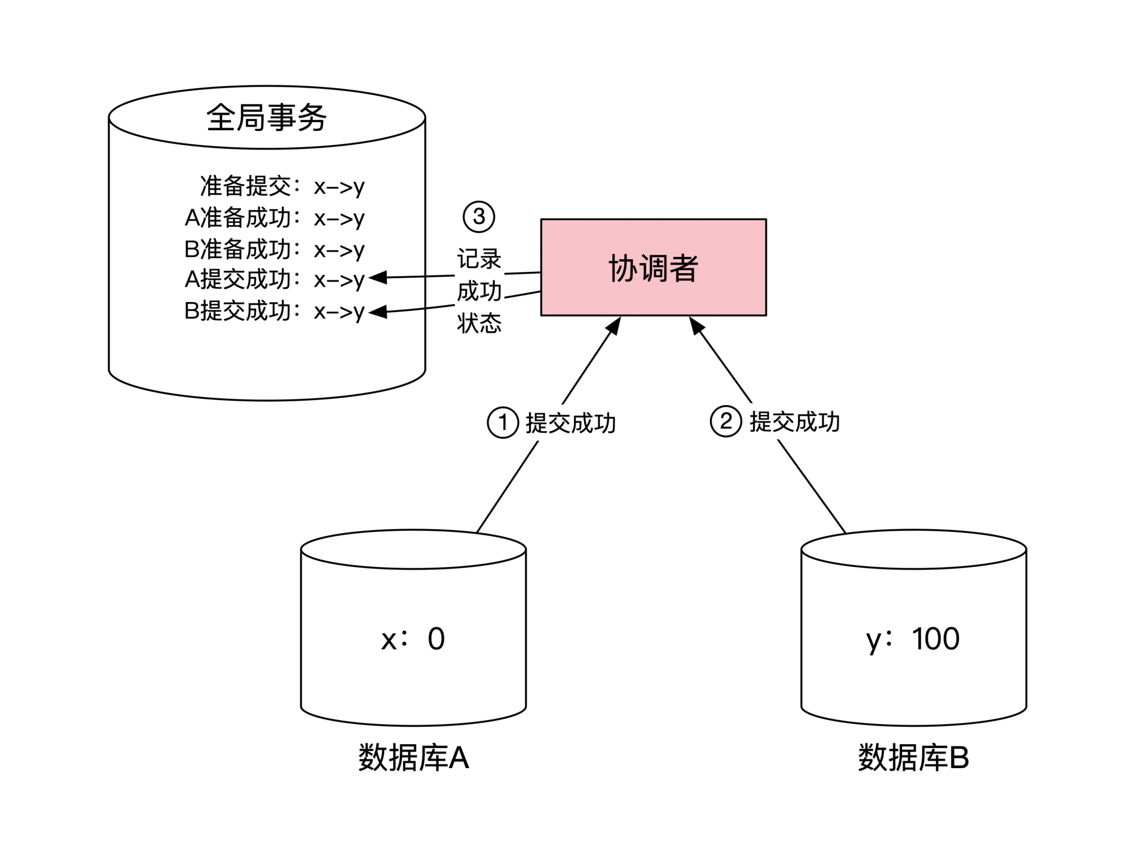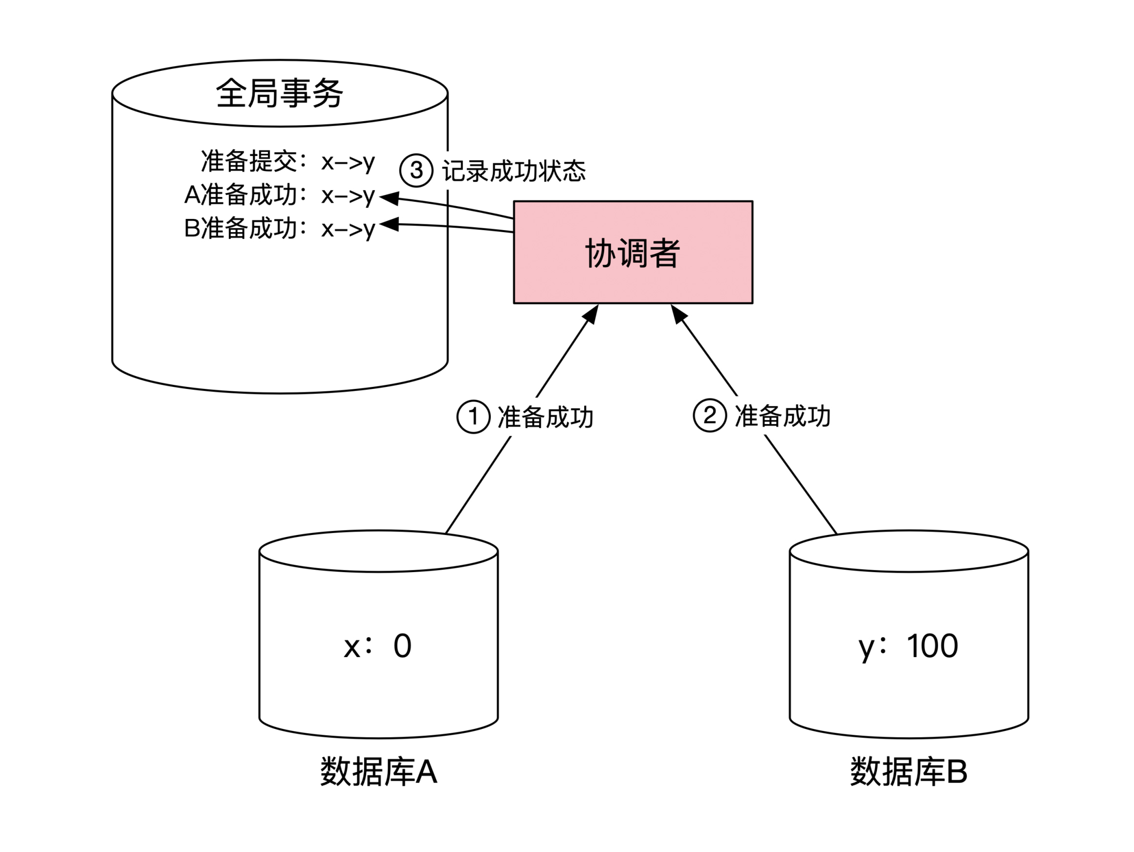 同样,数据库 B 将 y 变为100后也会返回给协调者准备成功的消息。然后协调者将这两个数据库的返回状态记录到自己的全局事务状态表里。这一步示意图如下: