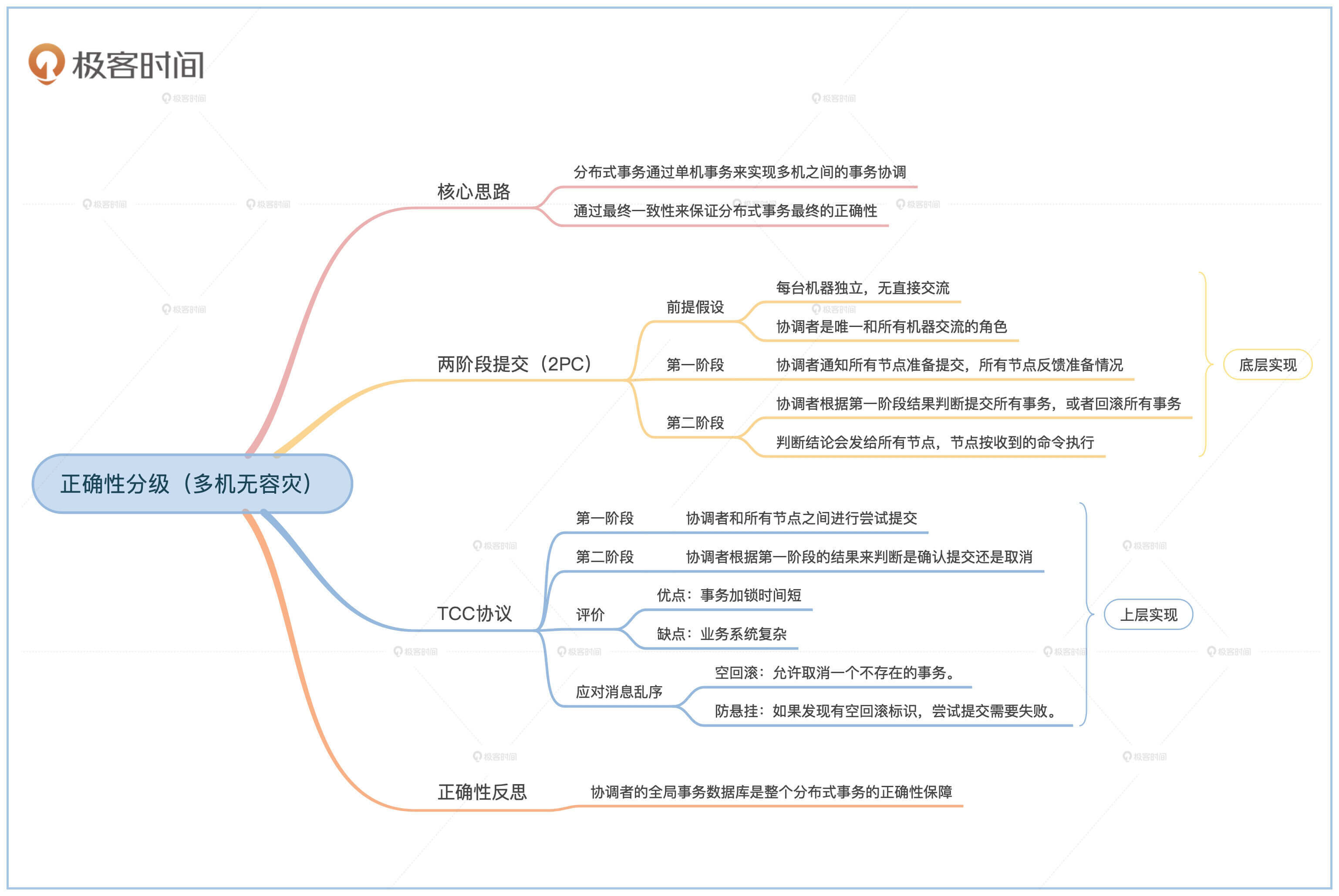 如果想要具有分布式事务(Distributed Transaction)的能力,就需要有个方法把局部的信息收集起来做集中决策。这个收集的过程和做集中决策的过程也需要有事务的保证。通过单机事务来达到多机之间的事务协调,通过单机事务的正确性来保证全局事务的正确性,你在后面的学习中一定要注意这个核心思路。