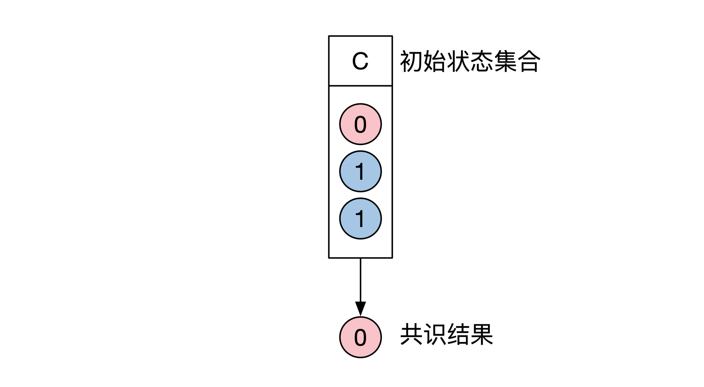 一致性相对好理解一点。一致指所有结果都需要完全相同。终止性和一致性有一个更通俗的解释:所有机器的状态初始可以在0和1中任意选择,最后当共识算法结束的时候,所有还活着的机器需要输出一样的结果,要么都是0,要么都是1。示意图如下:-