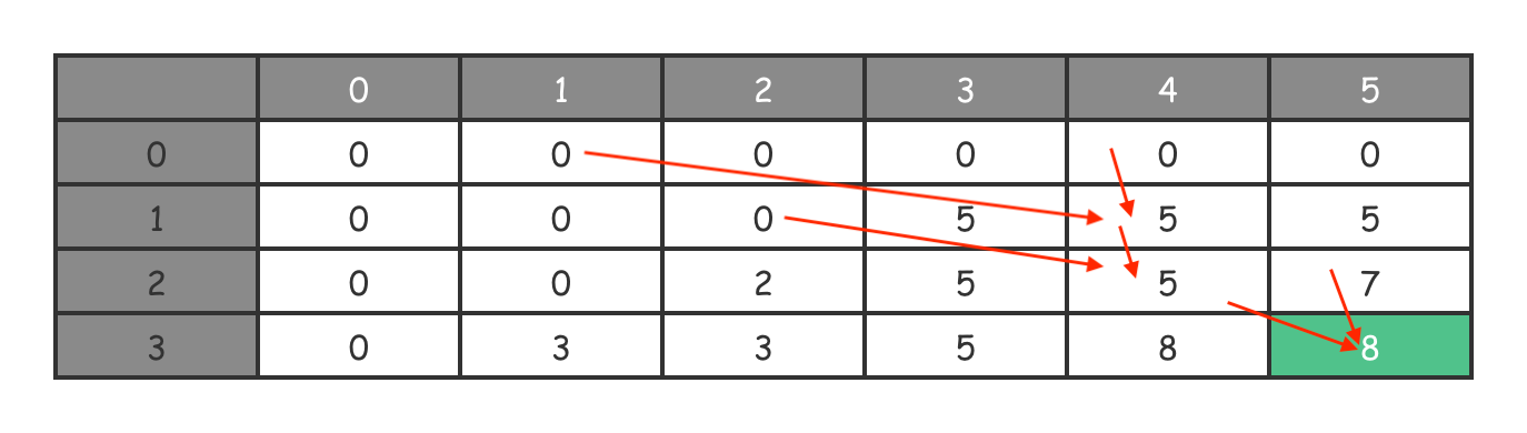 我在下面的表格中,用箭头画出了容量为 5 时的求解路径。你可以参照这个求解路径来加深对代码的理解。
