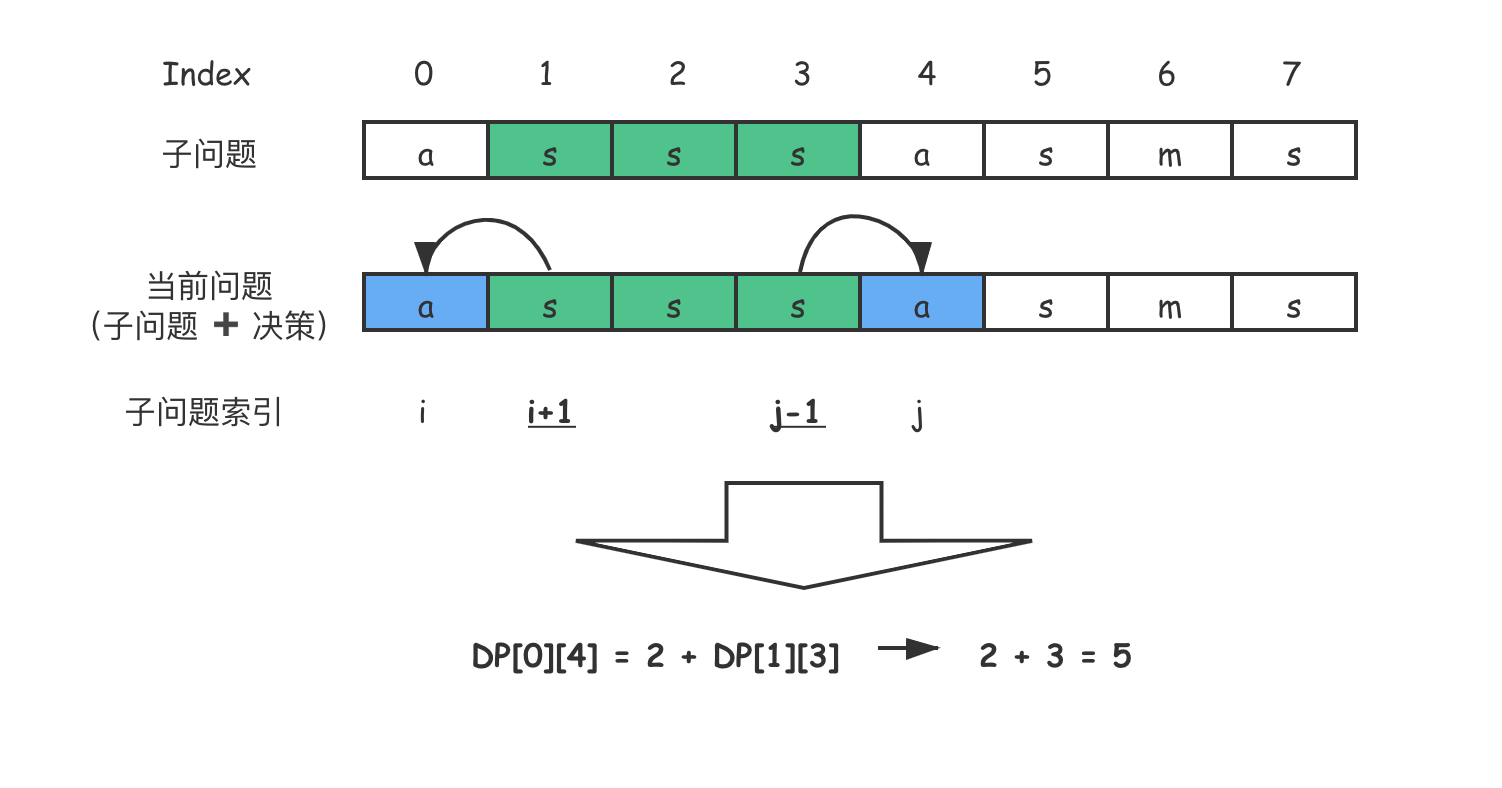 那么让状态转移的决策是什么呢?其实这里的决策跟回文子串问题类似,当前子问题的答案就是通过前面的子问题 ➕ 当前的决策推导出来的。
