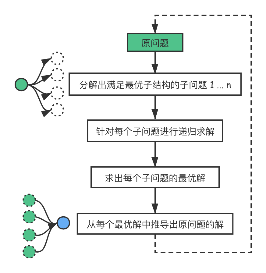 从这个意义上说,动态规划是一种思想,而非传统意义上的算法:如果我们要求解原问题,就需要求解其不同部分(即子问题),再根据子问题的解推导计算出原问题的解。