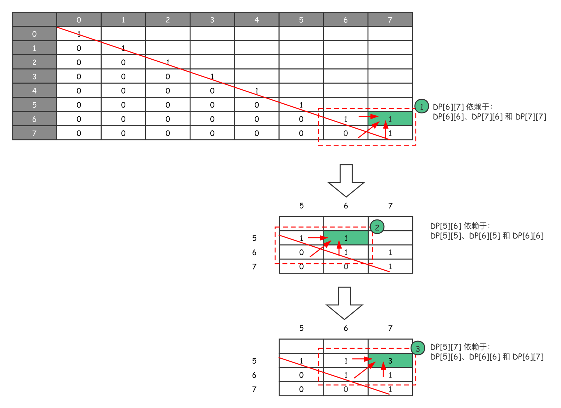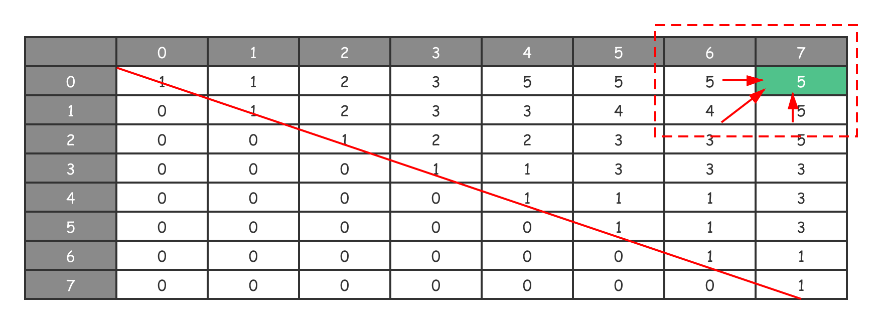 以下红色虚线框,就是最后一次子问题求解的计算过程,\(DP\[0\]\[7\]\) 依赖于 \(DP\[0\]\[6\]\)、左下角 \(DP\[1\]\[6\]\) 和正下方 \(DP\[1\]\[7\]\) 这几个子问题,求得了最后问题的答案。但是从代码上可以看出,我们的计算是从右下角斜向左上角计算的,具体参见下图: