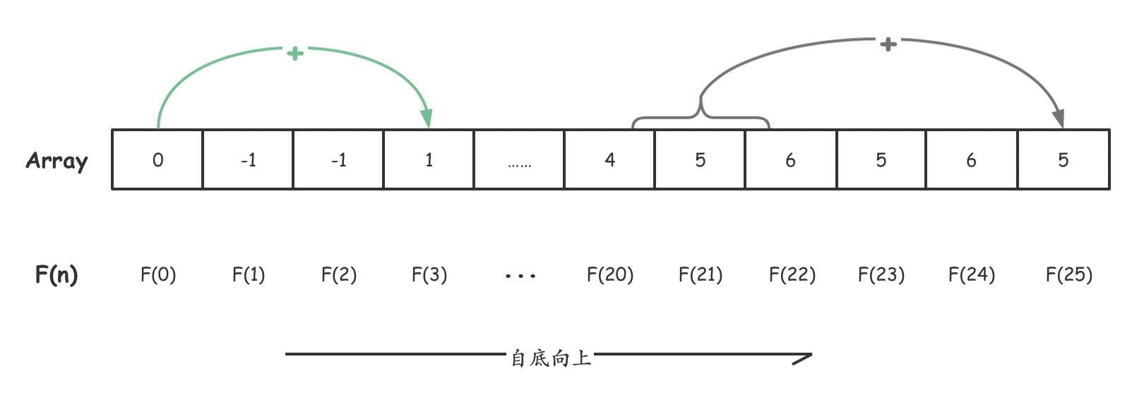 现在,之前的递归问题被我们转换成了一个迭代的问题,现在我们只需要通过循环求解 F(0) 到 F(25) 即可。具体可以参见第4课的相关代码。