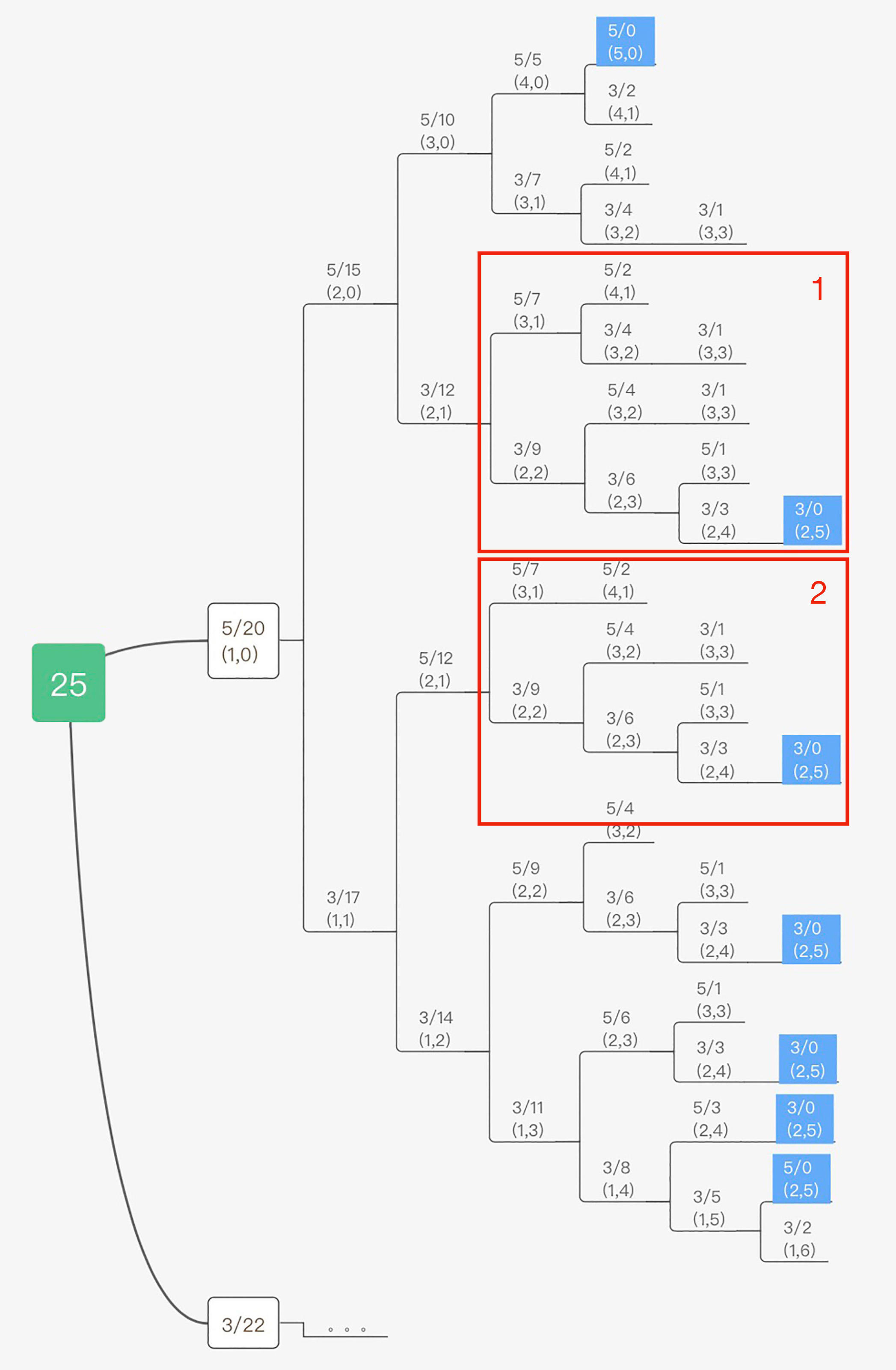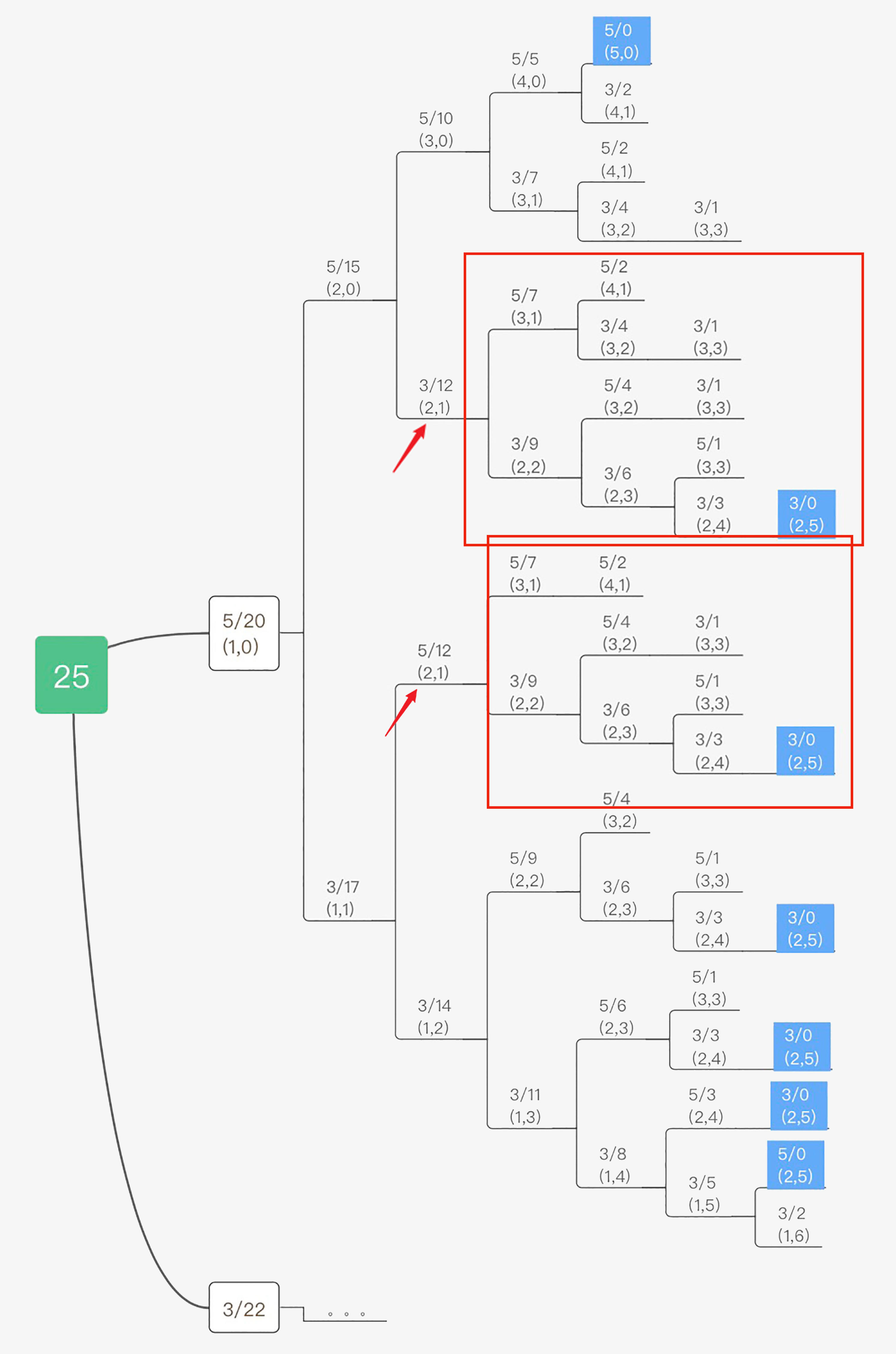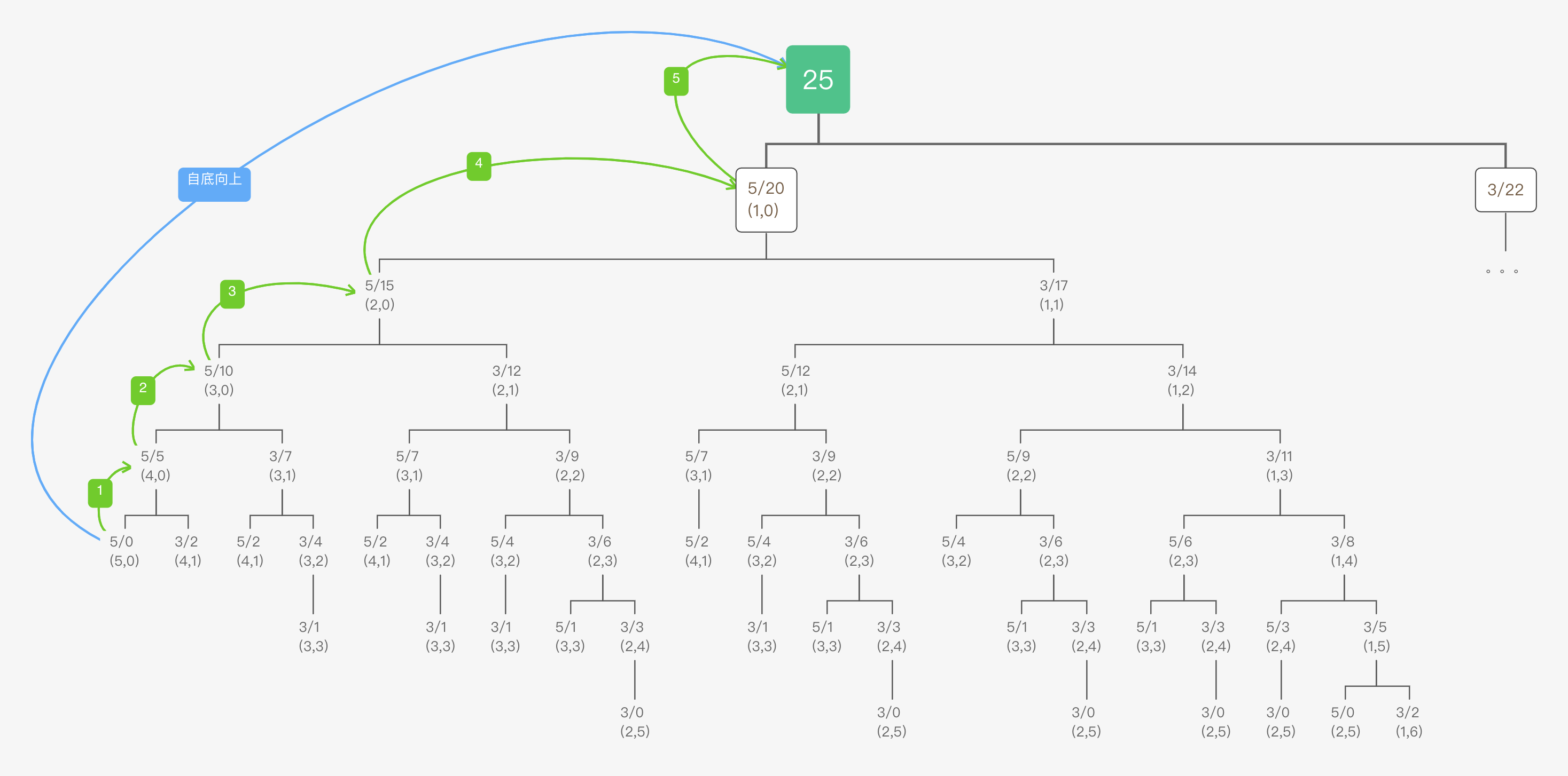 比如我们看一下 c[0]=5, c[1]=3 且 k=25 这种情况,整个求解过程我们可以画成下面这棵树。