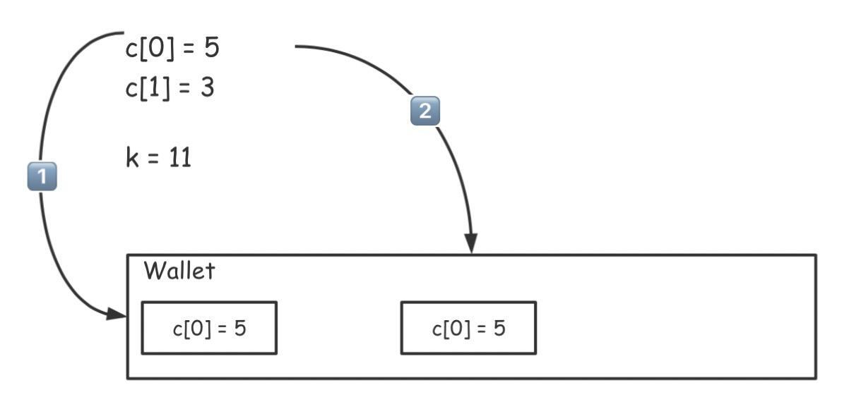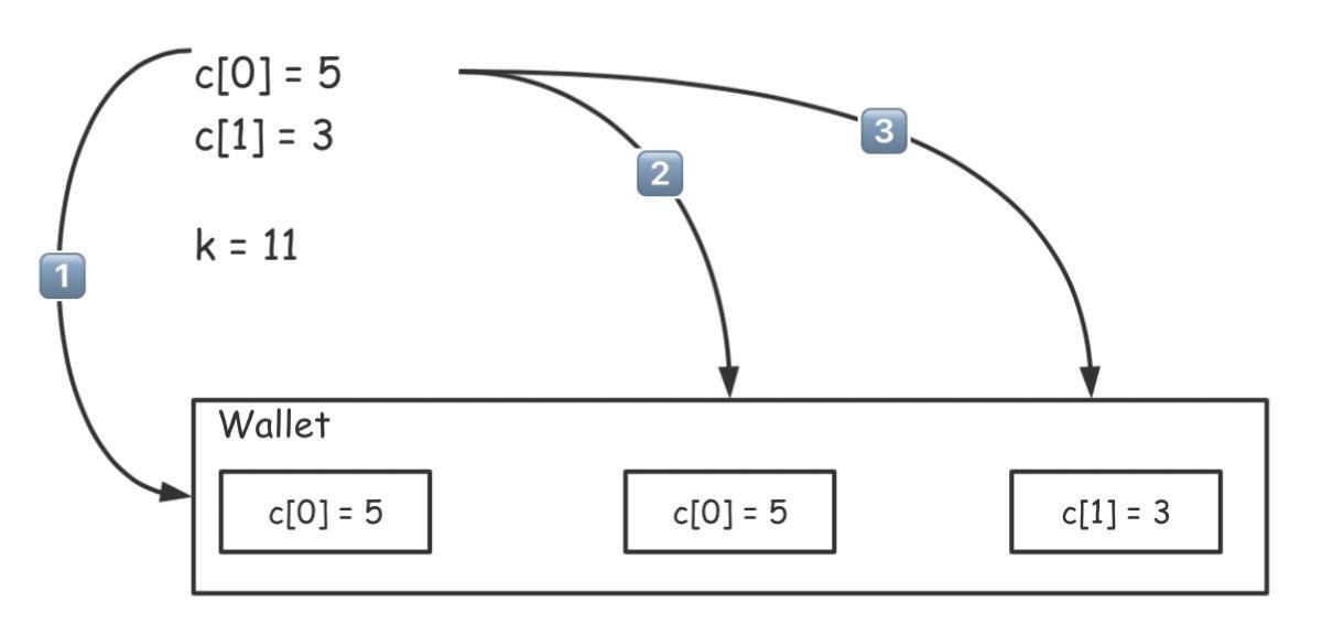 但是这种贪心是无法解决所有问题的,比如假设我们现在需要在 c[0]=5, c[1]=3 且 k=11 的情况下寻求最少硬币数。如果按照同样的原则,选择了两枚 5 元硬币后就只剩下 1 元了,如下图所示: