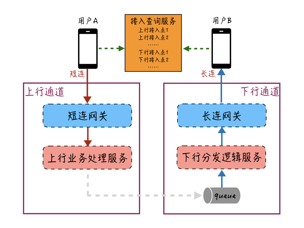 用户A和用户B分别都通过接入查询服务来获取最优接入点,用户A通过上行通道的短连接网关来发送消息,发送的消息在上行业务处理服务进行存储、加未读等业务操作;然后通过消息队列把这条消息给到下行通道,下行分发逻辑服务查询用户B的在线状态等信息,并对消息进行必要的推送准备处理(比如版本兼容处理);接着把消息给到用户B的长连接所在的长连网关机器,长连网关机器再将消息推送到用户B的设备中。
