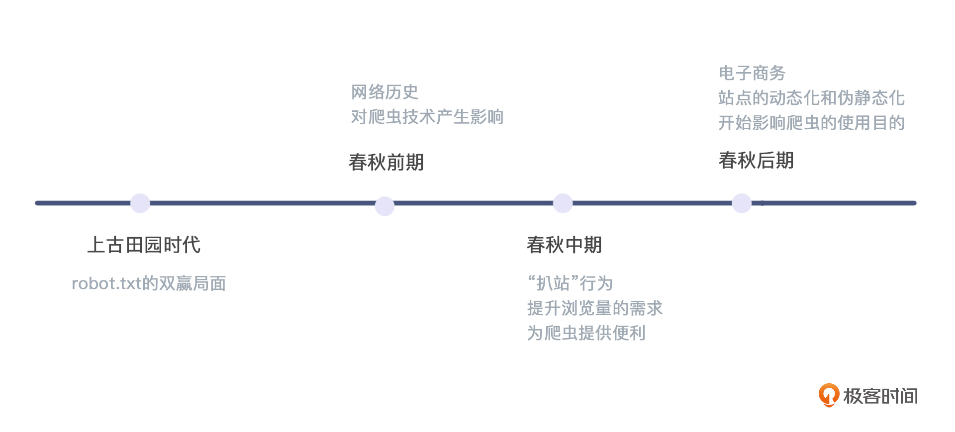 好了,最后我来给你小结一下。今天和你聊了爬虫的产生、早期历史以及一些相关的技术变迁。