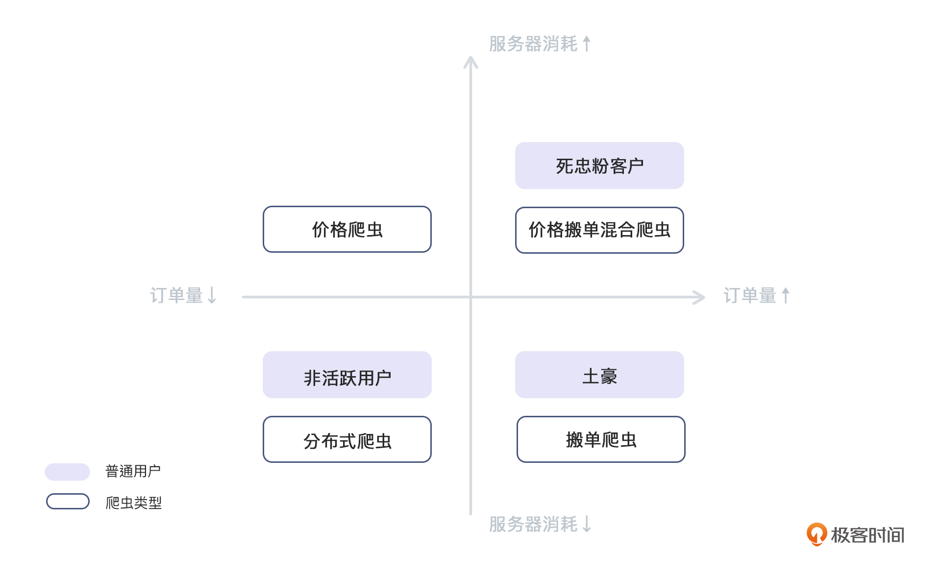 除了分布式爬虫,这里还出现了两个新的定义:价格爬虫和搬单爬虫。当然,他们都属于咱们在06讲中说过的分布式爬虫,只不过这里因为有了明确的目的,就单独进行讨论了。最后,图表中还有一个分类是由价格爬虫和搬单爬虫两者混合组成的。它们虽然大幅提高了订单量,但也让服务器的消耗变高了。这里,我们明确一下两个新名词的定义: