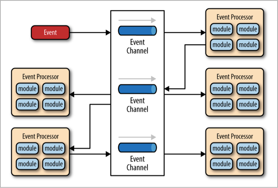 这种架构模式的运作方案是,在子系统之间建立一套事件队列管道(Event Queues),来自系统外部的消息将以事件的形式发送到管道中,各个子系统可以从管道里获取自己感兴趣、可以处理的事件消息,也可以为事件新增或者是修改其中的附加信息,甚至还可以自己发布一些新的事件到管道队列中去。