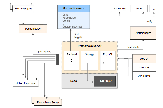 那么按照定义,Prometheus应该算是处于狭义和广义的度量系统之间,尽管它确实内置了一个界面解决方案“Console Template”,以模版和JavaScript接口的形式提供了一系列预设的组件(菜单、图表等),让用户编写一段简单的脚本就可以实现可用的监控功能。不过这种可用程度,往往不足以支撑正规的生产部署,只能说是为把度量功能嵌入到系统的某个子系统中,提供了一定的便利。
