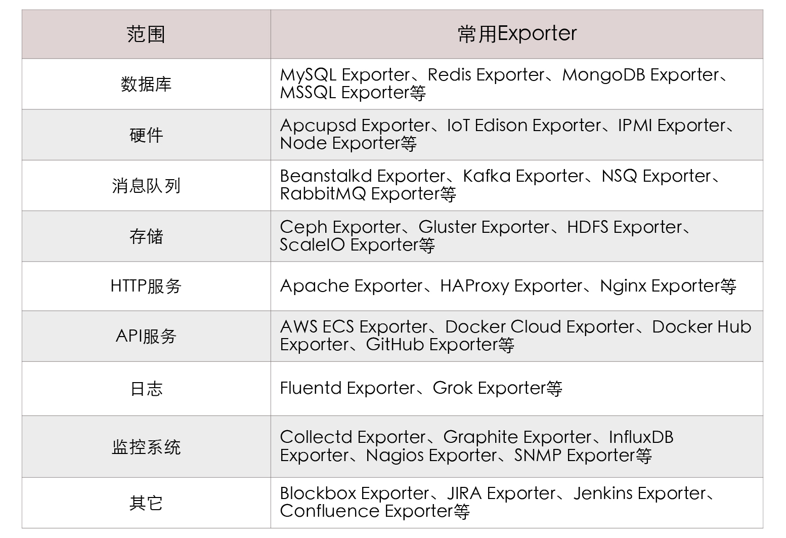 Exporter的作用就是以HTTP协议(Prometheus在2.0版本之前支持过Protocol Buffer,目前已不再支持)返回符合Prometheus格式要求的文本数据给Prometheus服务器。得益于Prometheus的良好社区生态,现在已经有大量、各种用途的Exporter,让Prometheus的监控范围几乎能涵盖到所有用户关心的目标,绝大多数用户都只需要针对自己系统业务方面的度量指标编写Exporter即可。你可以参考下这里给出的表格: