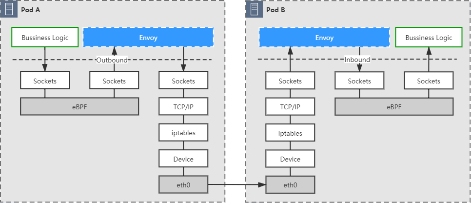 其中一种可行的优化方案,是使用eBPF(Extended Berkeley Packet Filter)技术,在Socket层面直接完成数据转发,而不需要再往下经过更底层的TCP/IP协议栈的处理,从而减少它数据在通信链路的路径长度。