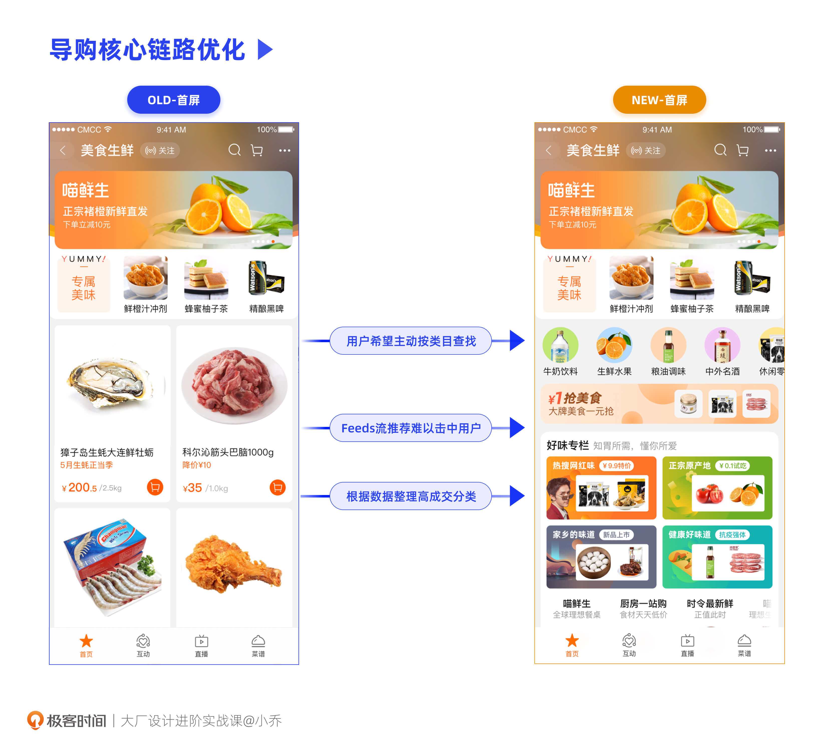 以淘宝曾经的美食频道页为例,根据数据可以得知,从频道页进入下一级详情页的转化率很低。通过访谈后发现,在当时的推荐算法下,商品难以击中用户,用户需要更为高效的导购形式。因此,在推荐商品卡片之前,设计了更为细分的导航。从商品品类梳理出牛奶饮料、生鲜水果等分类,也从用户成交转化较好的类型进行分类,梳理出热搜网红味、健康好味道等分类,大大提升了成交转化。