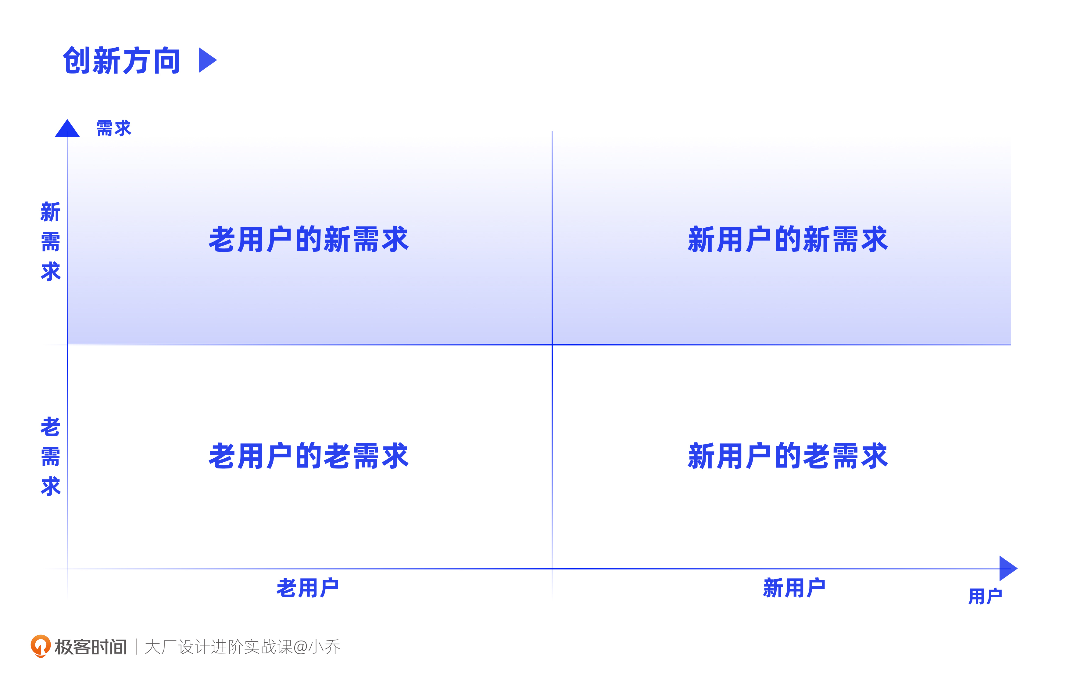 在之后的课程中,我们会讲到用户画像。原本定义的几种核心用户类型,在成长期和成熟期往往已经全面覆盖。此时,要开辟新的业务形态,就需要朝行业上下游扩展新方向,挖掘老用户的新需求和新用户的新需求。