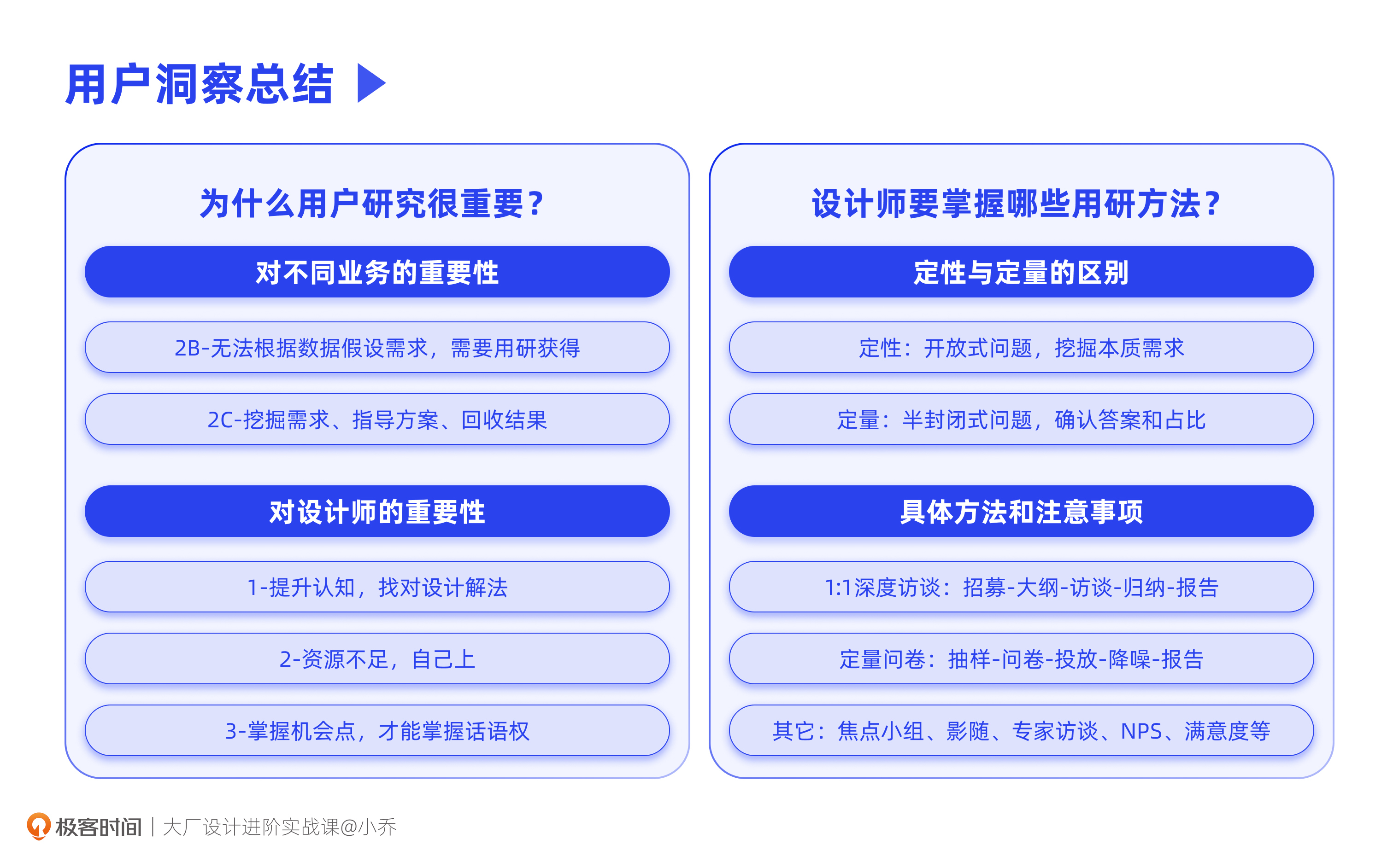 对于我们设计师来说,把握住用户洞察,也就掌握了话语权。这节课的目的并不是让设计师成为一个优秀的用研,而是要把用研能力作为我们的装备,从而创造更大的设计价值,获得成长与回报。