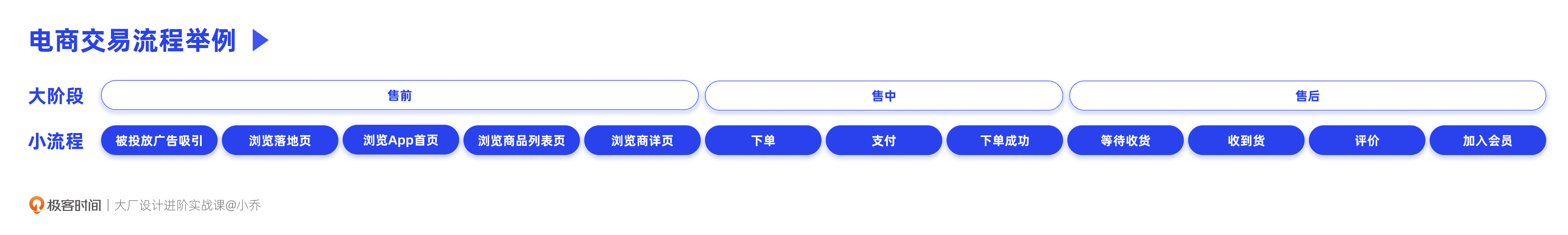我们以电商的交易流程为例,它的大阶段可以是售前-售中-售后,小流程就是将每个阶段更为细化。比如售后有等待收货、收到货开箱、给出评价、加入会员等小流程。平台或商家为了引起用户的好评和复购,往往会在这些流程中提供促进转化的功能或服务,比如在下单成功页赠送下次购物的优惠券、在用户开箱时看到惊喜小礼物、引导高净值用户办理会员卡等等。