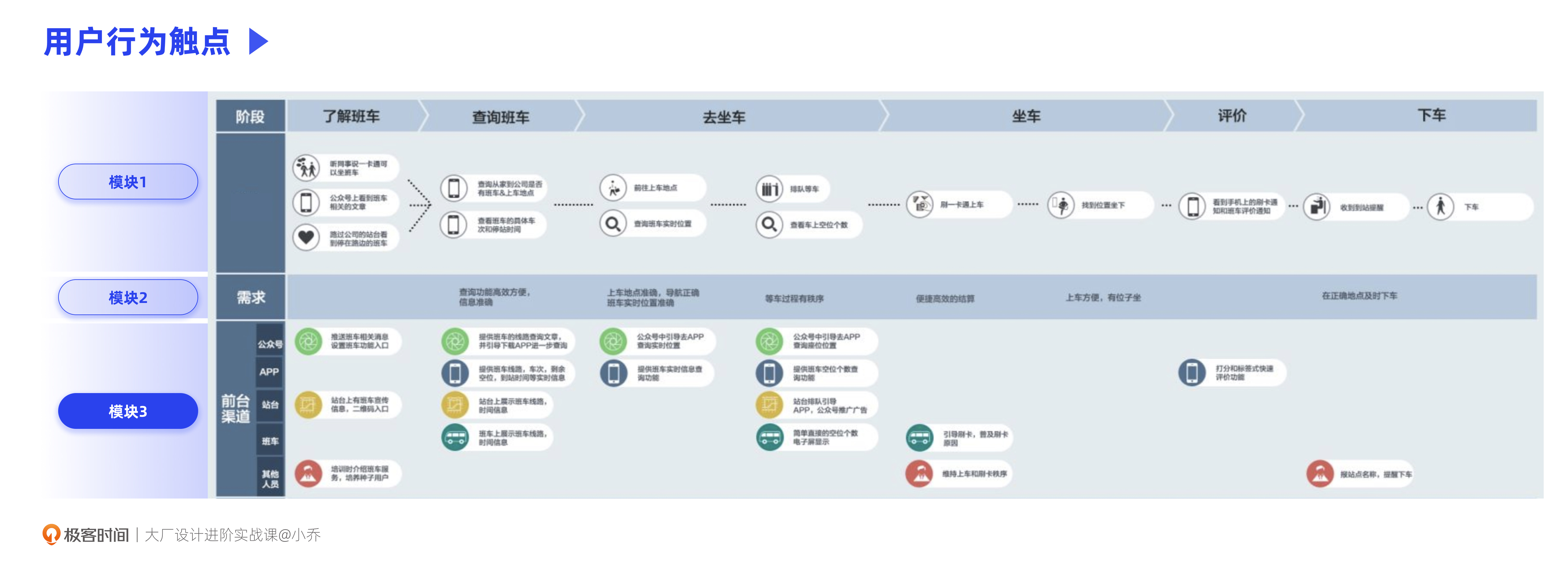 以下图为例,是我在咨询行业时,为老东家华为制定的员工乘坐班车流程,用户的行为触点有公众号、App、站台、班车和相关人员。