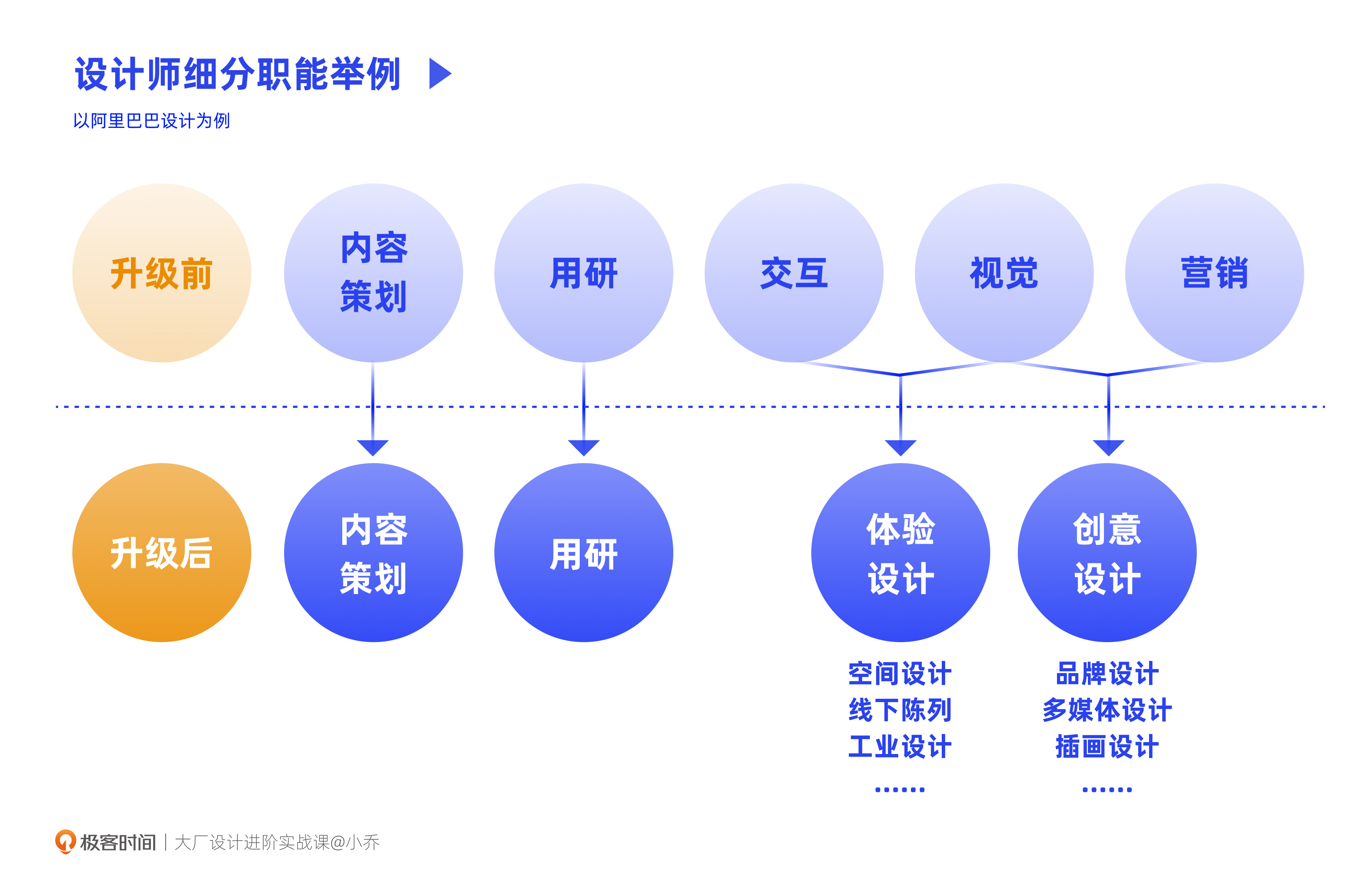 早在2017年,阿里就在进行设计师职能升级规划。在2018年就去除了交互和UI的分工,要求设计师全链路,将原本的交互、UI、工业设计、建筑设计、线下陈列设计等都称为“体验设计”,也就是大家常说的UX;而原本的营销视觉、插画、多媒体、品牌设计等合并为“创意设计”。不管是体验设计师还是创意设计师,都需要懂业务,有逻辑,而非停留在手活技法阶段