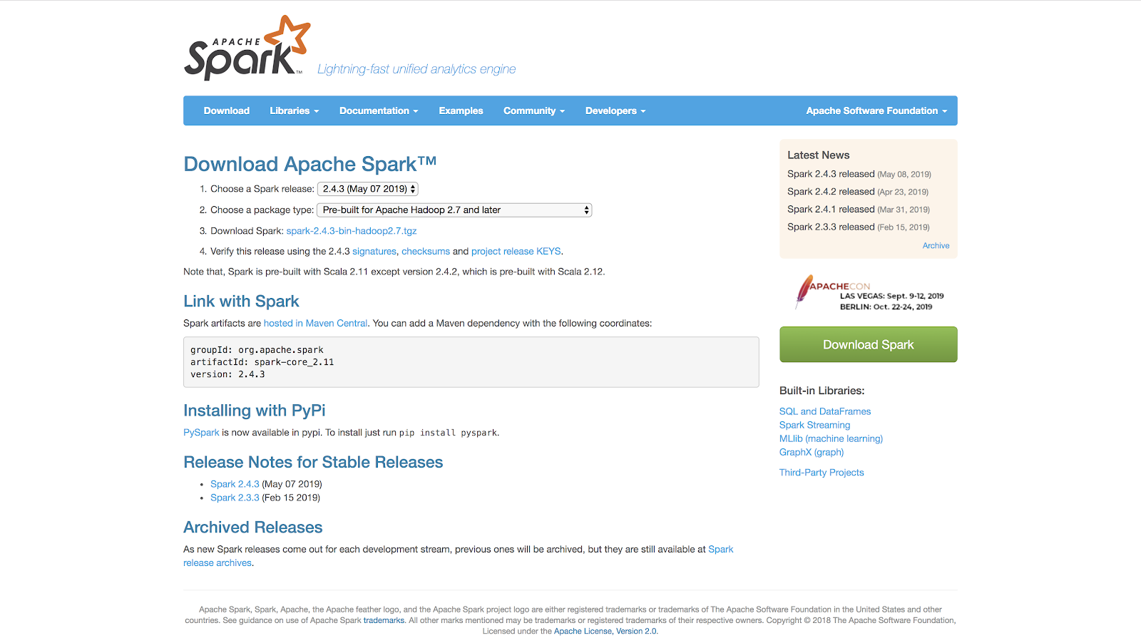 接下来我们就可以安装Spark。首先去Spark官网的下载界面。在第一个下拉菜单里选择最新的发布,第二个菜单最好选择与Hadoop 2.7兼容的版本。因为有时我们的Spark程序会依赖于HDFS和YARN,所以选择最新的Hadoop版本比较好。