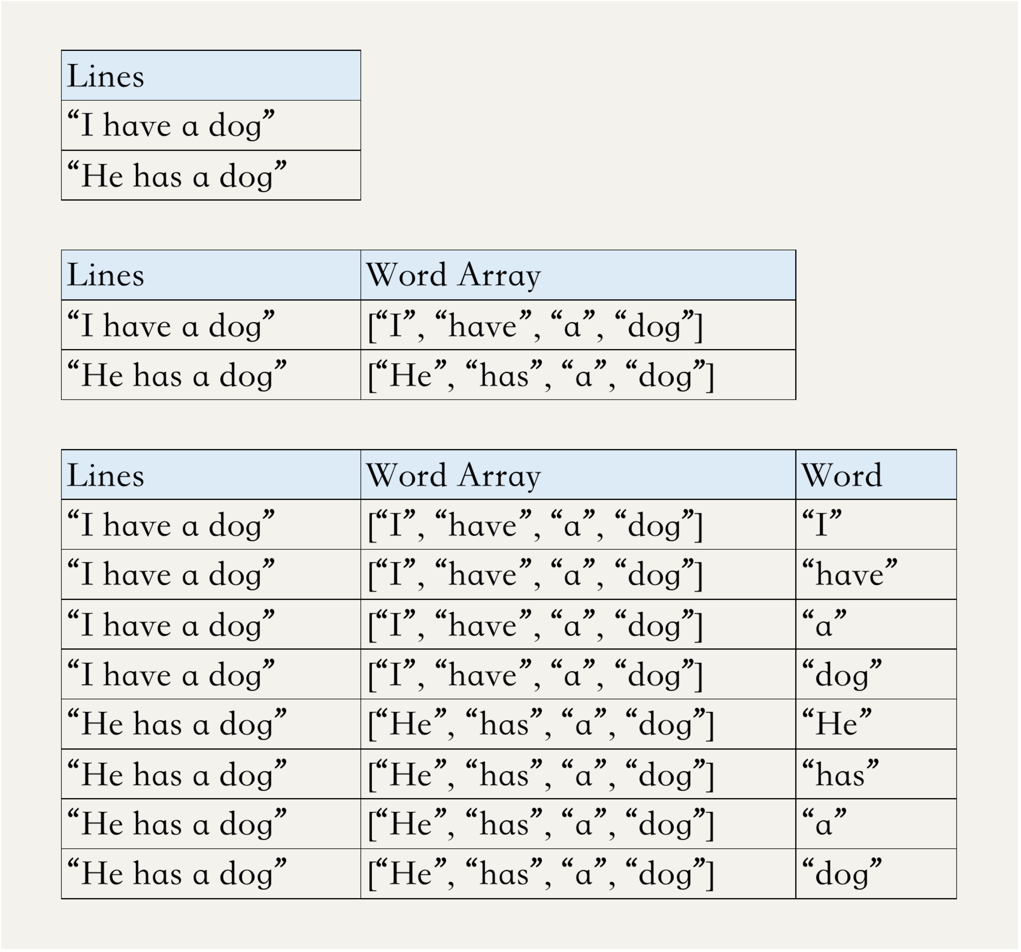 由于之前代码中创建的df_lines这个DataFrame中,每一行只有一列,每一列都是一个包含很多词语的句子,我们可以先对这一列做split,生成一个新的列,列中每个元素是一个词语的数组;再对这个列做explode,可以把数组中的每个元素都生成一个新的Row。这样,就实现了类似的flatMap功能。这个过程可以用下面的三个表格说明。