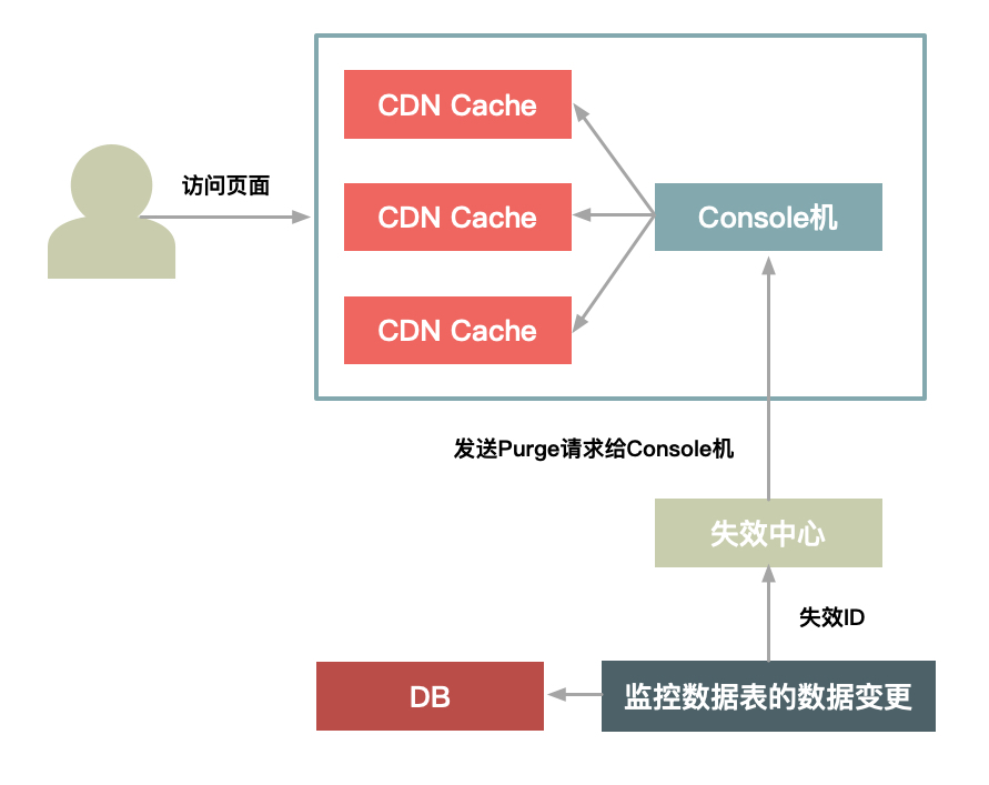 这种失效有失效中心将失效请求发送给每个CDN节点上的Console机,然后Console机来发送失效请求给每台Cache机器。