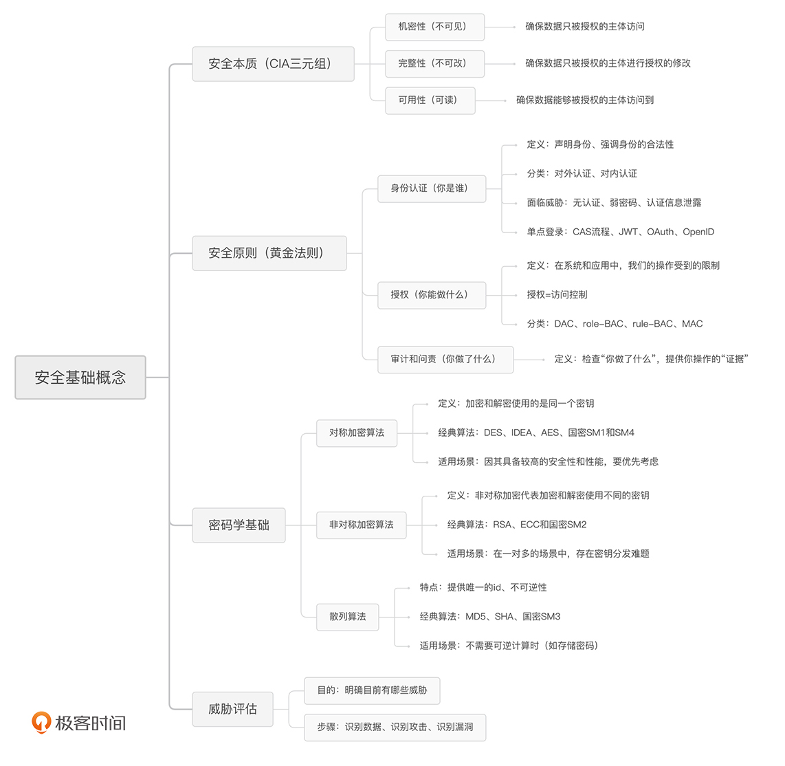讲到这里,关于安全基础的理论知识部分我们就全部讲完了。我把这一模块的重点内容梳理了一个脑图。你可以用它来查漏补缺,也可以自己来梳理看看,加深印象。