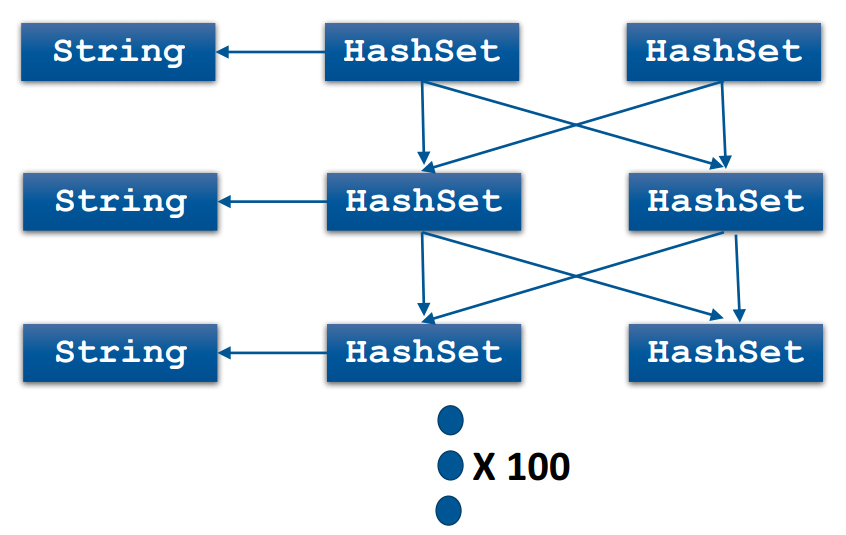 即使你对服务器进行了一定的安全防护,控制了黑客掌控服务器所产生的影响,黑客还是能够利用反序列化漏洞,来发起拒绝服务攻击。比如,曾经有人就提出过这样的方式,通过HashSet的相互引用,构造出一个100层的HashSet,其中包含200个HashSet的实例和100个String,结构如下图所示。