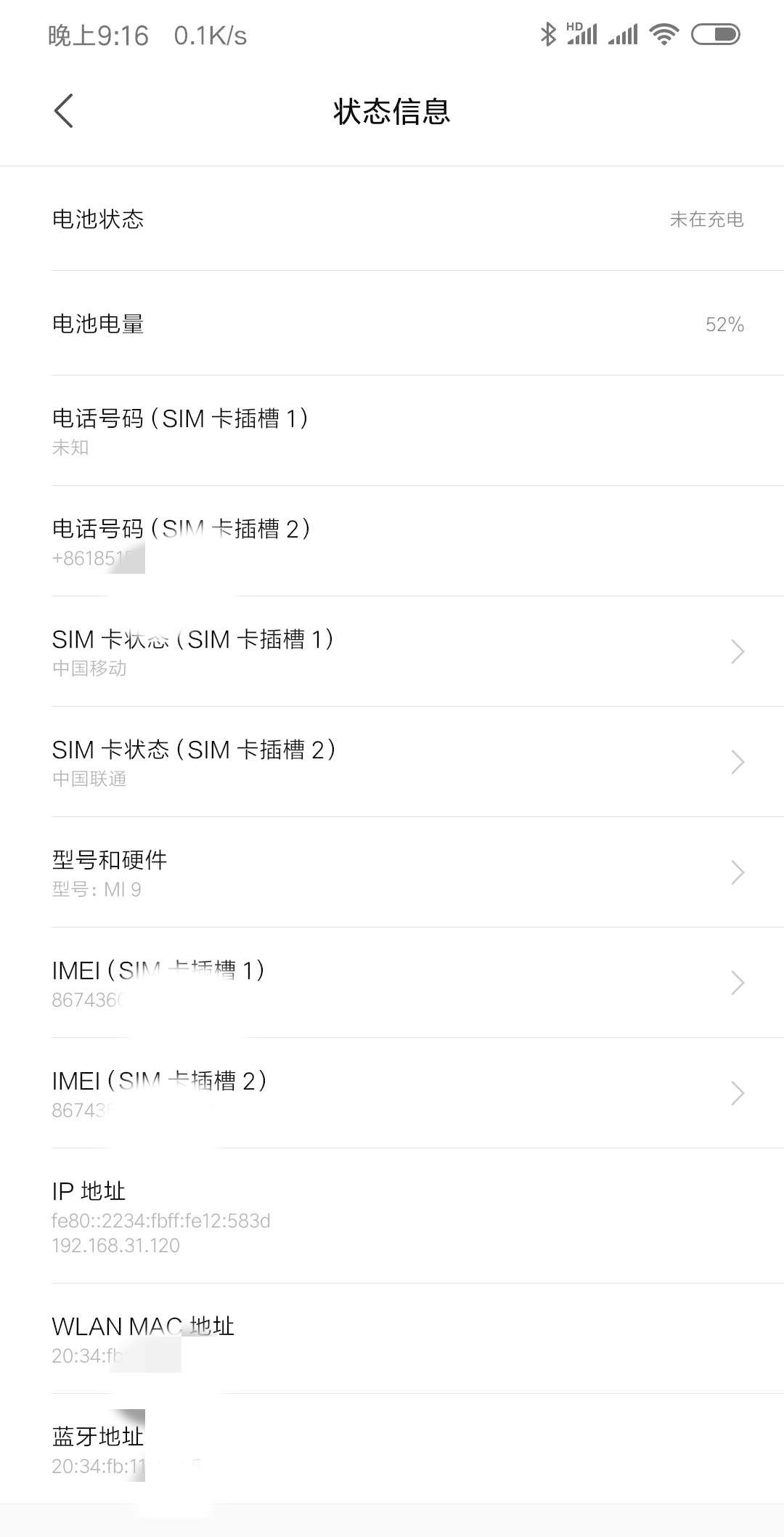 比如,下图是我手机的部分状态信息,其中的每一项都能够直接或间接地代表我的部分信息。比如,我使用了一张移动卡和联通卡,我的手机型号是小米9,我开着蓝牙等。