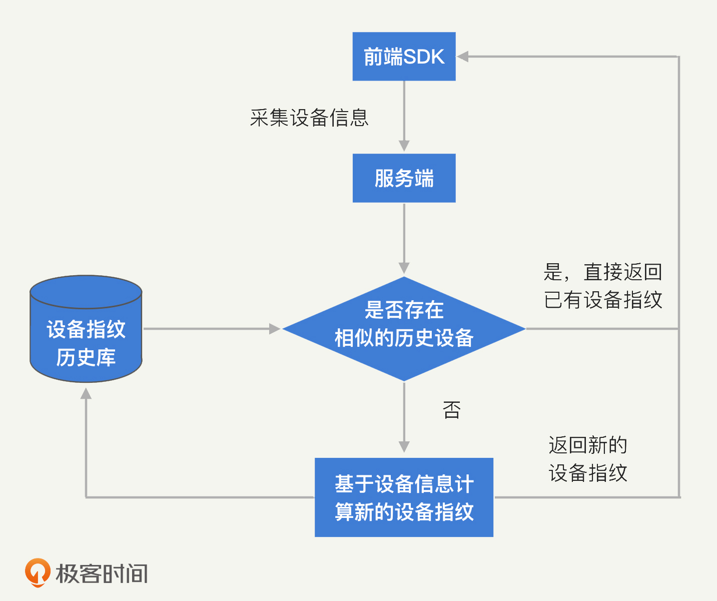 最后,如果判定这两组数据属于同一台设备,我们就分配相同的设备指纹。如果属于不同的设备,我们就为新采集的数据生成新的设备指纹。设备指纹分配的流程如下图: