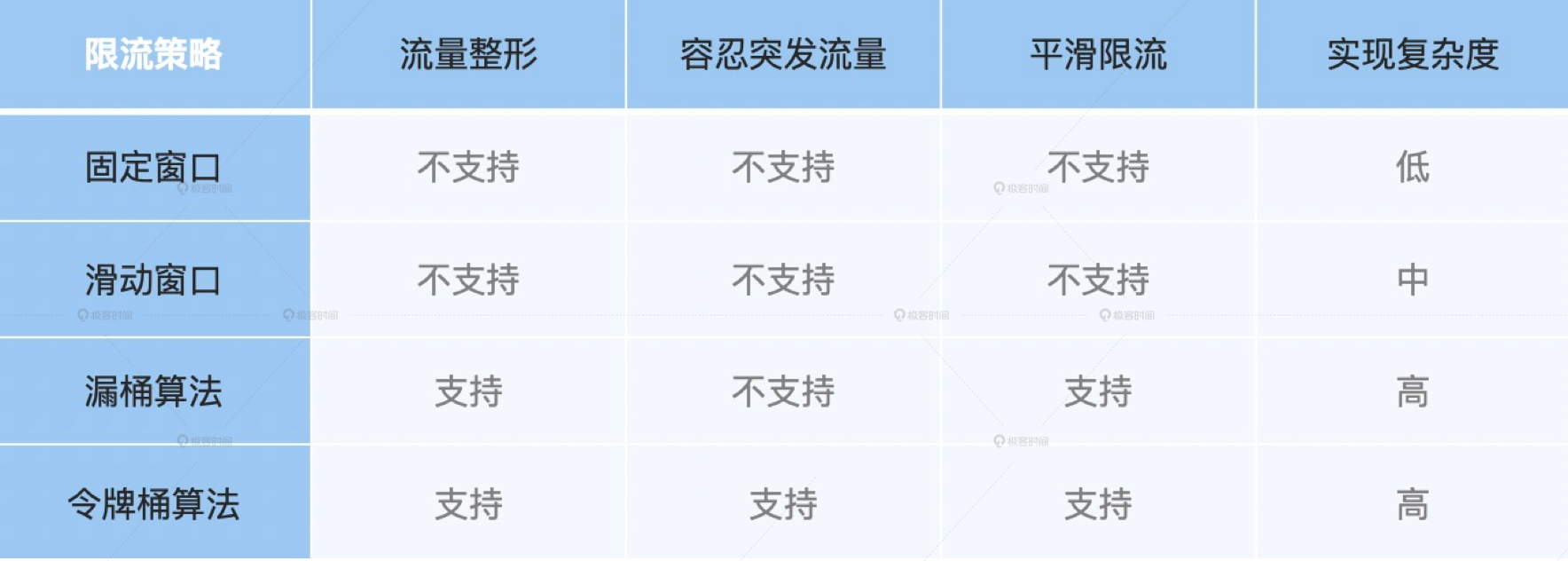 基于这三个特点,结合不同限流策略对流量控制方式的具体支持情况,我汇总出了下面这张表格。