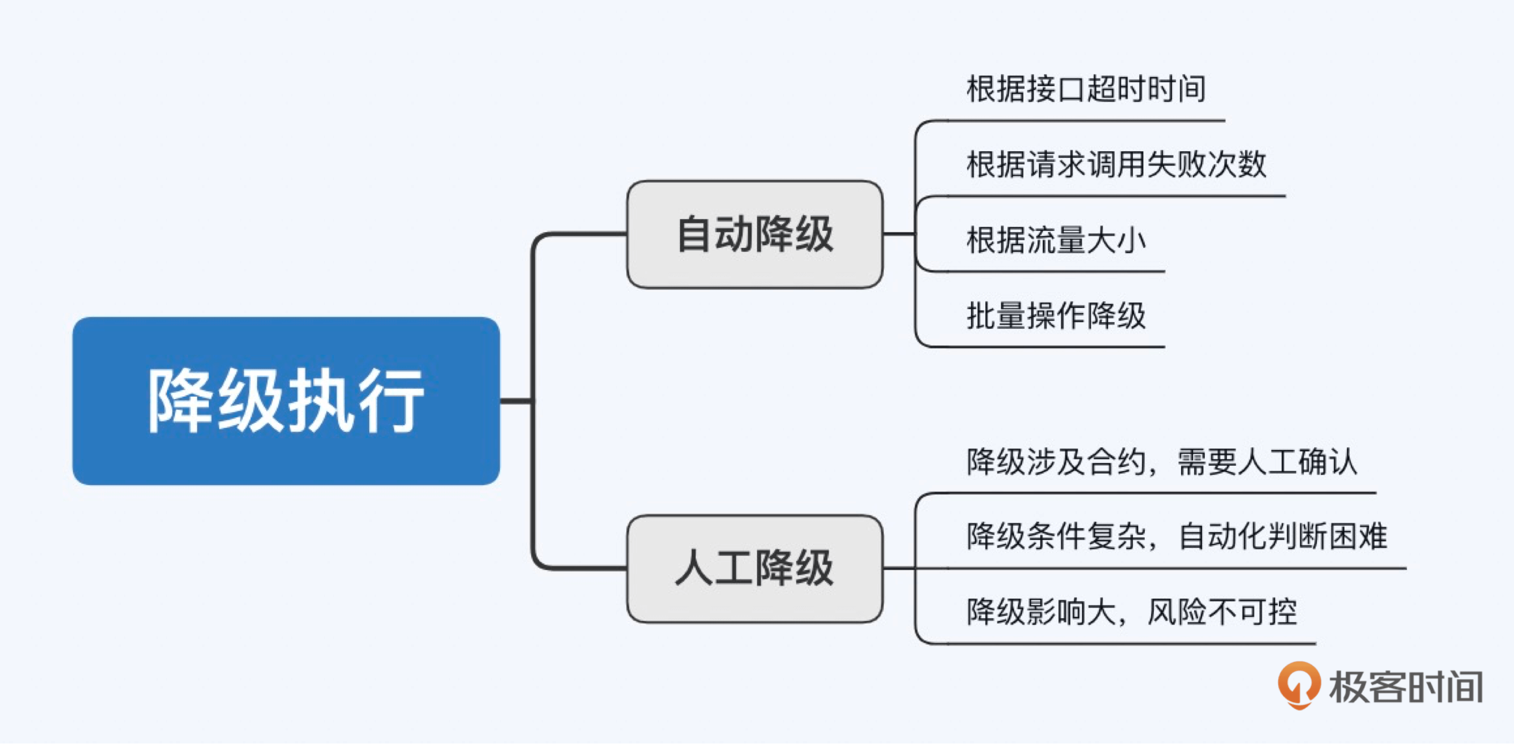 自动降级比较适合触发条件明确可控的场景,比如请求调用失败次数大于一定的阈值,或是服务接口超时等情况;还有一些旁路服务,比如审查日志记录等,如果压力过大也可以直接触发自动降级。我将这些要点总结为下面这张导图,供你参考。