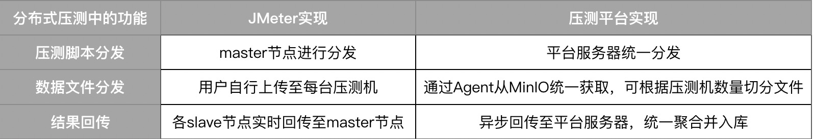 这时候怎么办呢?上面我提到过,对开源工具不成熟的功能应当规避,因此,我们可以在每台压测机中植入一个Agent,它能够与压测平台服务器通过长连接的方式建立通信,这样平台就可以直接对压测机进行调度。这种方案相当于我们在平台层重新实现了JMeter的分布式调度功能,两者的实现对比见下表。