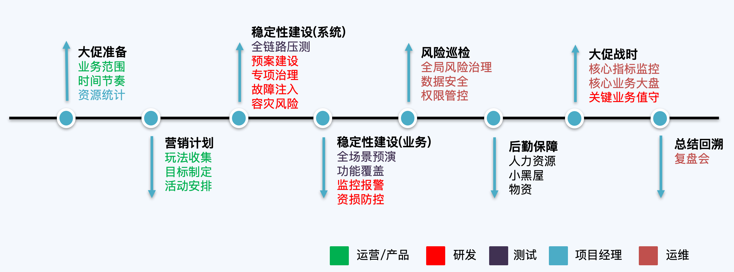 我以大促活动为例,通过下面这张图可以看到,互联网公司的主要职能角色几乎都参与到了大促容量保障的各项工作中,这其中还没有包含财务、HR等支持性角色。那么多角色共同做同一件事,组织建设显然是非常重要的工作。